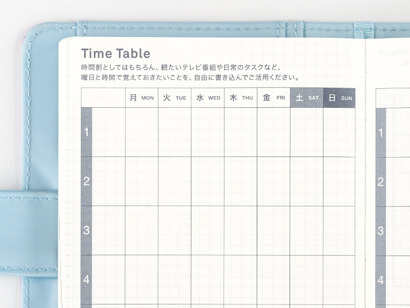 The book includes two timetables for writing in a recurring hourly schedule for each day of the week. These are useful, say, for filling in the broadcast times of favorite television shows, or splitting up house chores.
