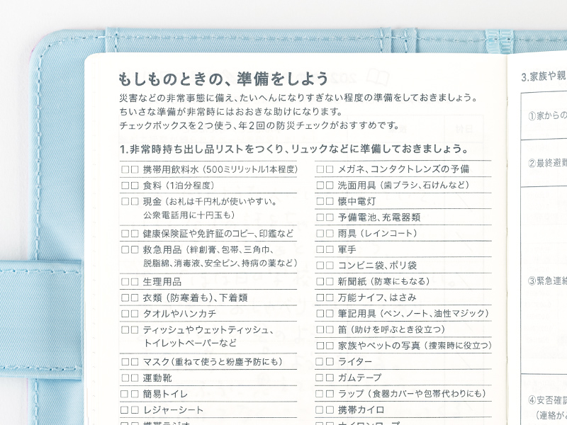 This page contains a checklist of items to have ready in case of an emergency. There is also a space to list nearby evacuation zones (common in Japan), emergency contact information and topics discussed between family and friends.