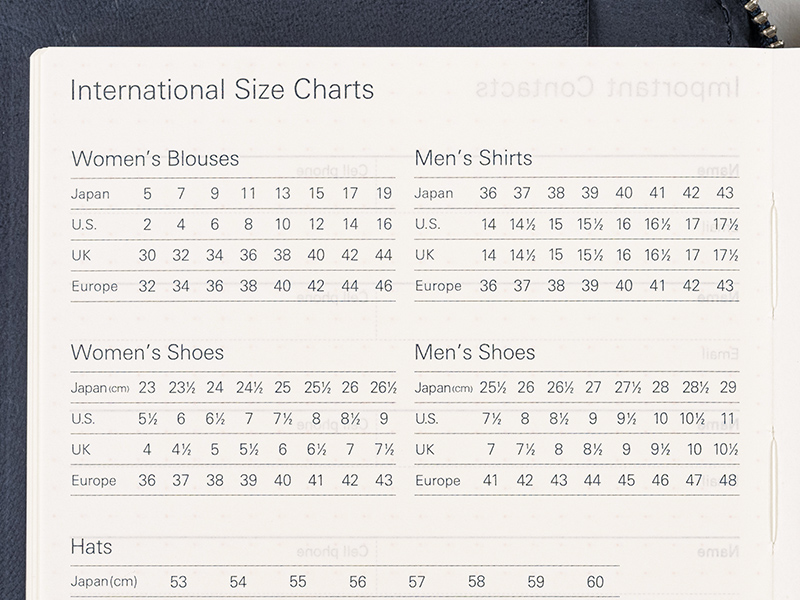 Comparison charts for Japan, the US, the UK, and Europe include items such as clothing, shoes, hats and rings.