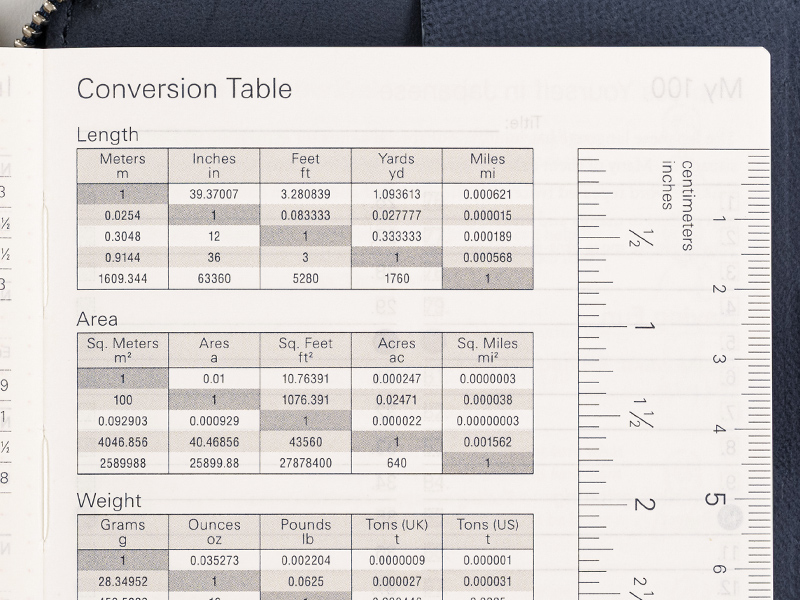 This chart features conversions between units of measurement for easy reference and calculation, including a small ruler to measure centimeters and inches.