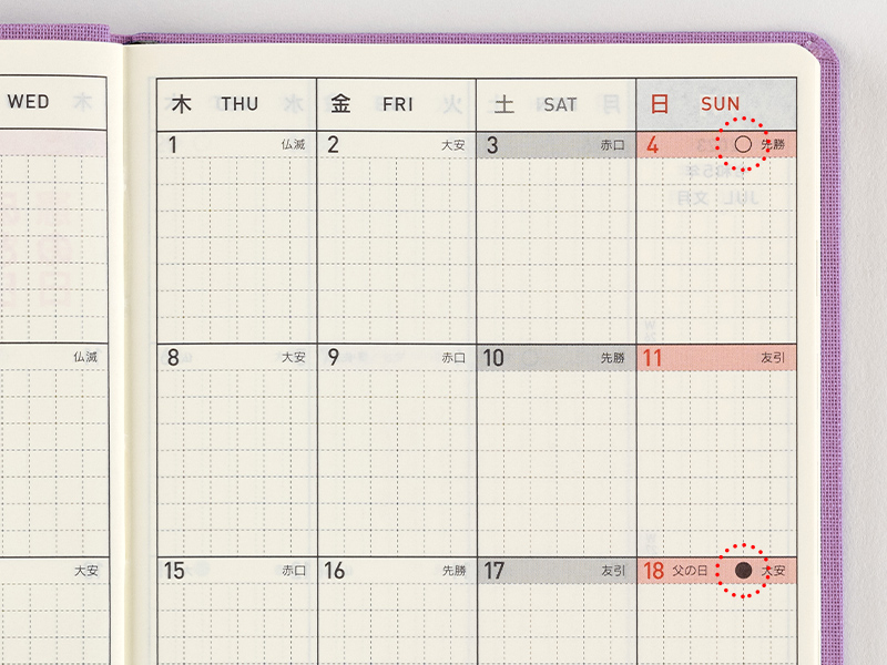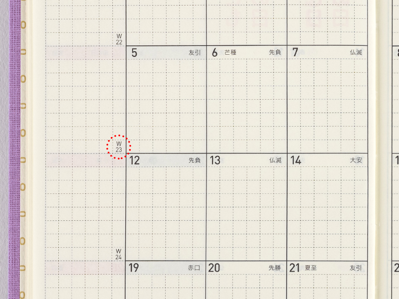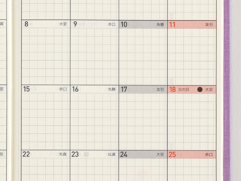 The monthly calendar is ideal for managing schedules. The graph paper design is lightly printed to make it easier to write in your plans and take notes in an even line. The subdued gray and red allow for high visibility when writing in the calendar.