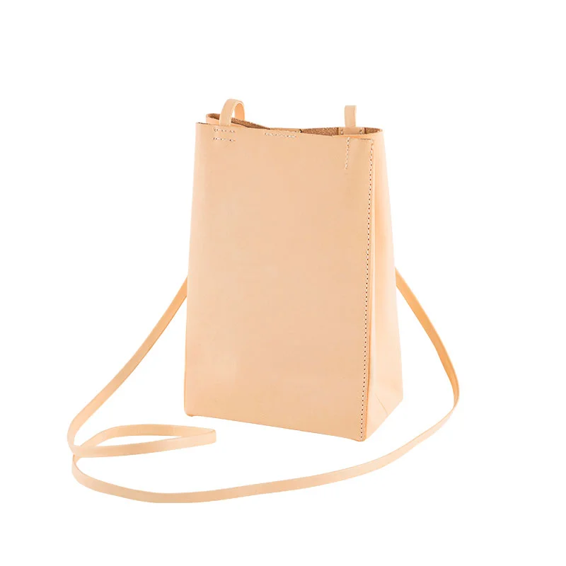 It has a thin leather strap to hang from your shoulder so you can keep your hands free while you carry around the items you need. You can adjust the length of the strap by tying the edges.