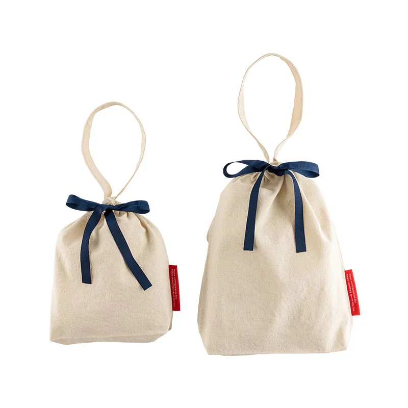 The gift bag is made with cotton, giving it a simple, warm feel. You can pull the top of the bag closed with its elegant-looking navy ribbon.