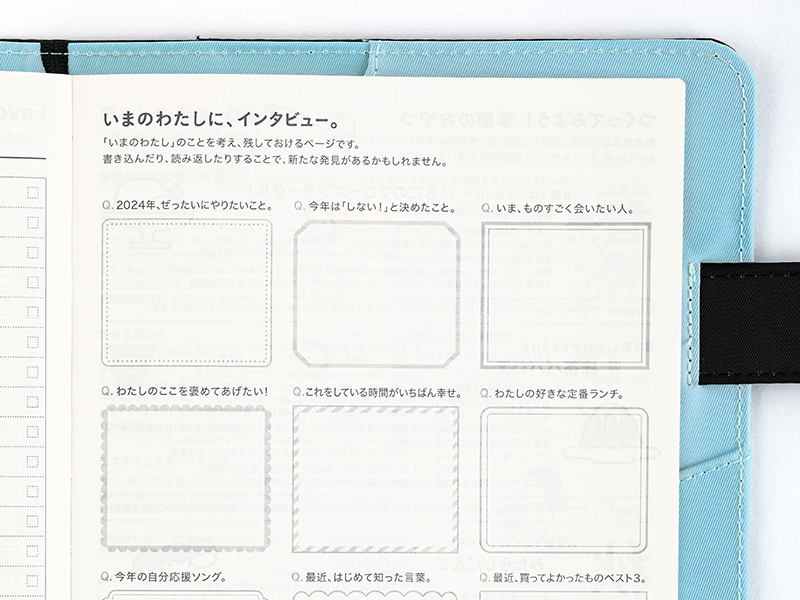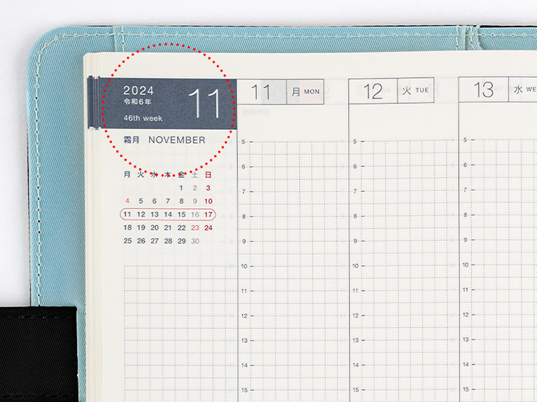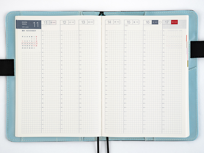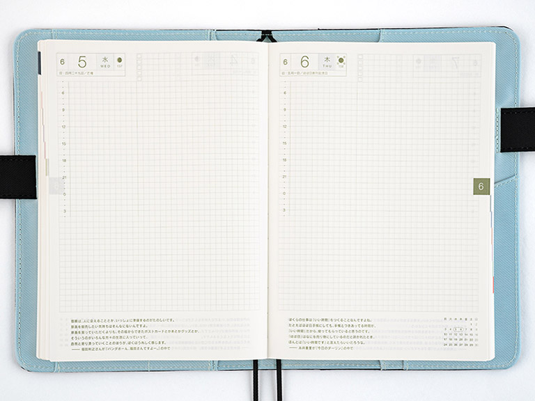 The one-day-per-page A5-size techo was created in response to customer requests for more space to fill with writing and clippings and is designed to be paired with the A5 cover of your choice. The Cousin is perfect for collecting a great deal of information into a single book, using as a school notebook or parenting diary, or simply writing in larger letters. The larger size means this book is ideal for leaving in a single place at work or at home. The Cousin also has an exclusive section: the popular “Weekly Pages” tracks a week in each two-page spread for easy planning.