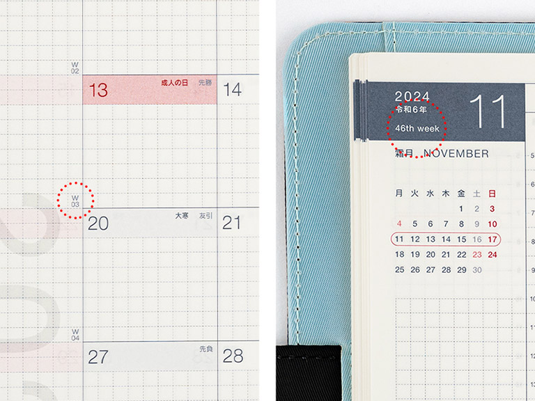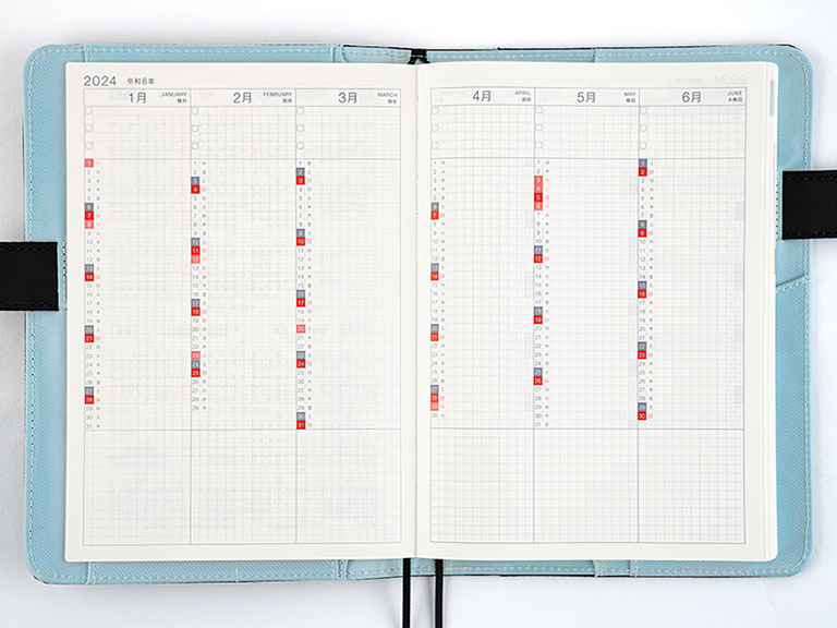 The monthly calendar is ideal for managing schedules. The graph paper design is lightly printed to make it easier to write in your plans and take notes in an even line. The blue gray and red print both allow for high visibility when writing in the calendar.