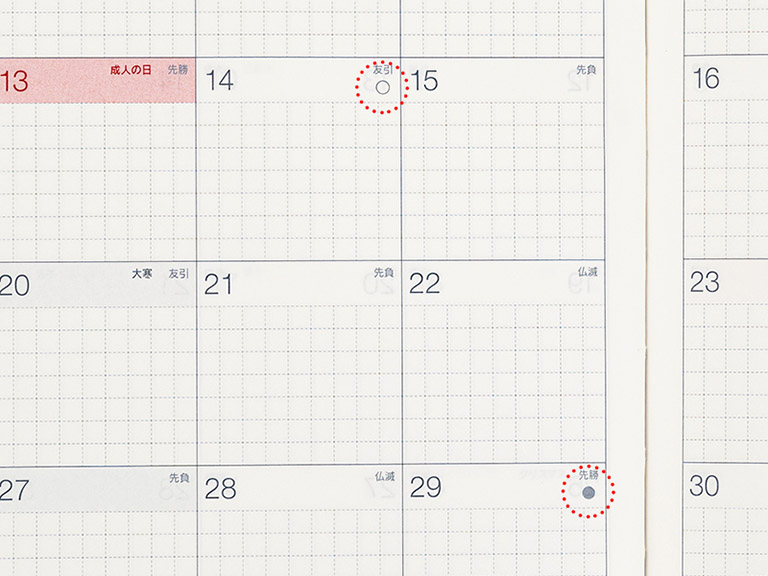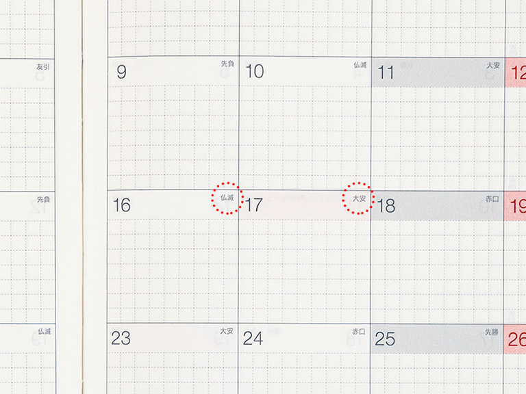 The monthly calendar days are labeled with rokuyo, a cycle of six days said to predict good or bad fortune that day. The labels are commonly found on Japanese calendars and used to plan weddings and funerals.
