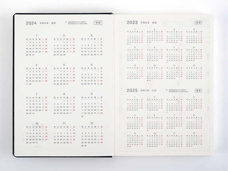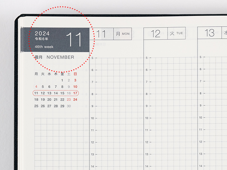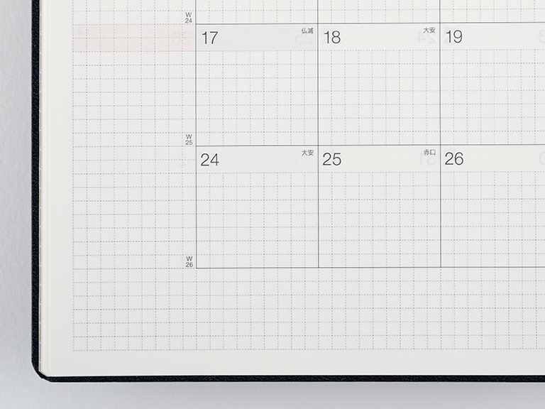 The monthly calendar is ideal for managing schedules. The graph paper design is lightly printed to make it easier to write in your plans and take notes in an even line. The blue gray and red print both allow for high visibility when writing in the calendar.