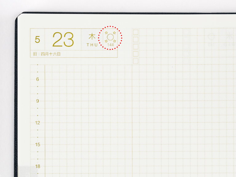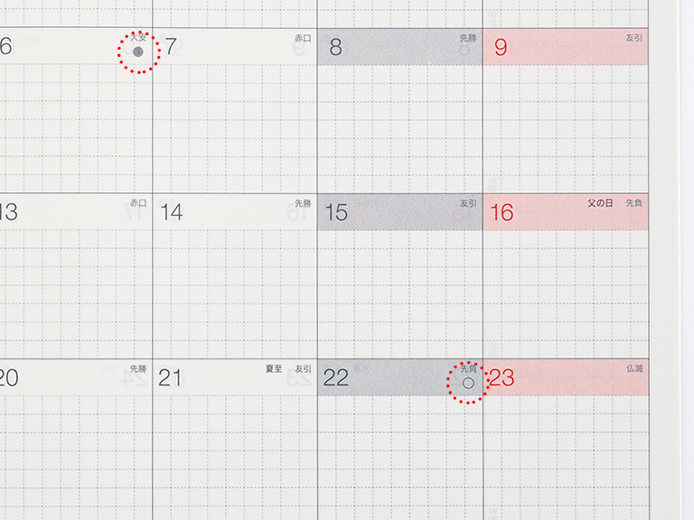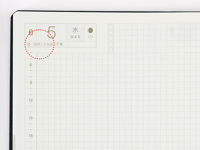 The date of the old Japanese lunisolar calendar is also included under the day’s date. This calendar was used in Japan until 1873, when Japan adopted the universal Gregorian calendar. Some days in this lunisolar calendar are specified as standard days signifying the changing of the seasons. We’ve also included solar terms based on this ancient calendar.