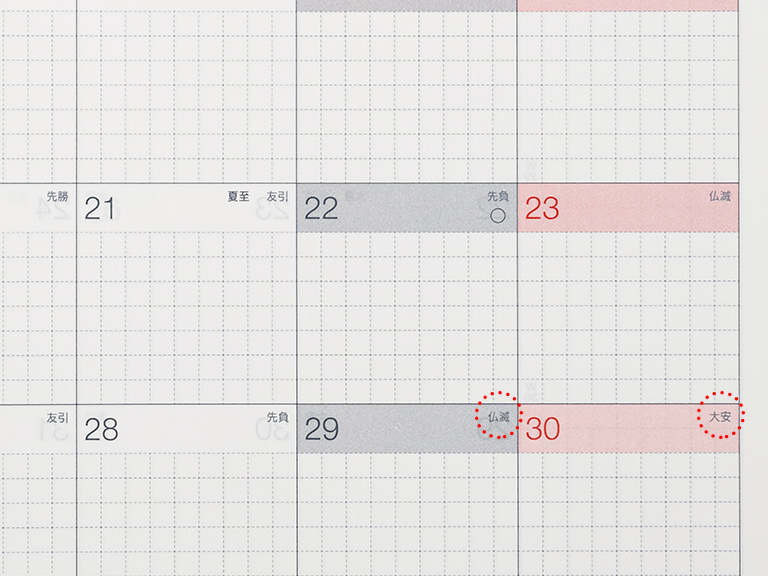 The monthly calendar days are labeled with rokuyo, a cycle of six days said to predict good or bad fortune that day. The labels are commonly found on Japanese calendars and used to plan weddings and funerals.