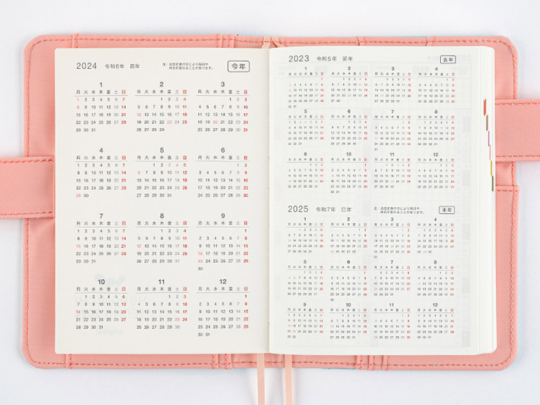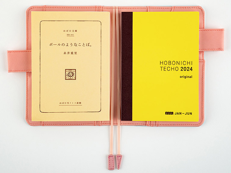 The front has a soft ivory hue, and features the label “HOBONICHI TECHO 2024 original” printed in gray letters if the book’s weekly calendars start on Monday and red if they start on Sunday. The April-start version includes the label “spring.”