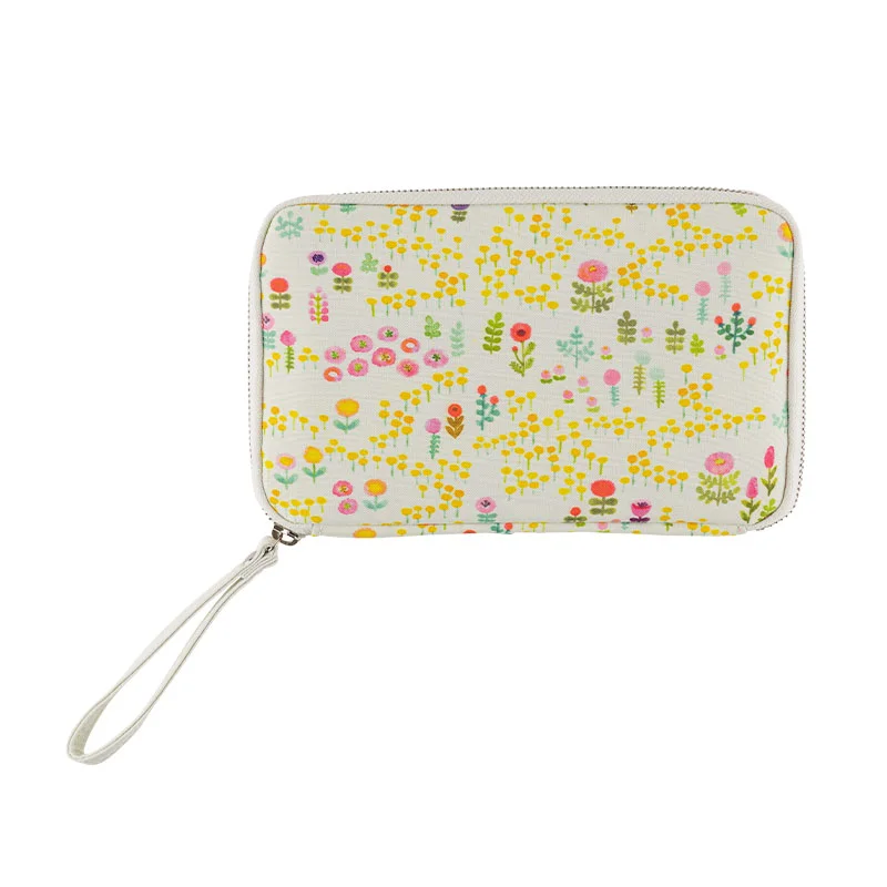 This printed fabric was illustrated by Aki Kondo, who is famous for creating picture books, coming up with the concept for Rilakkuma, and creating the characters Mofy the rabbit, woo and wah, and Ofuton-san. There’s a soft, mint blue background and a host of yellow and red flowers painted in watercolor to cheer you up. The interior is a soft lime.