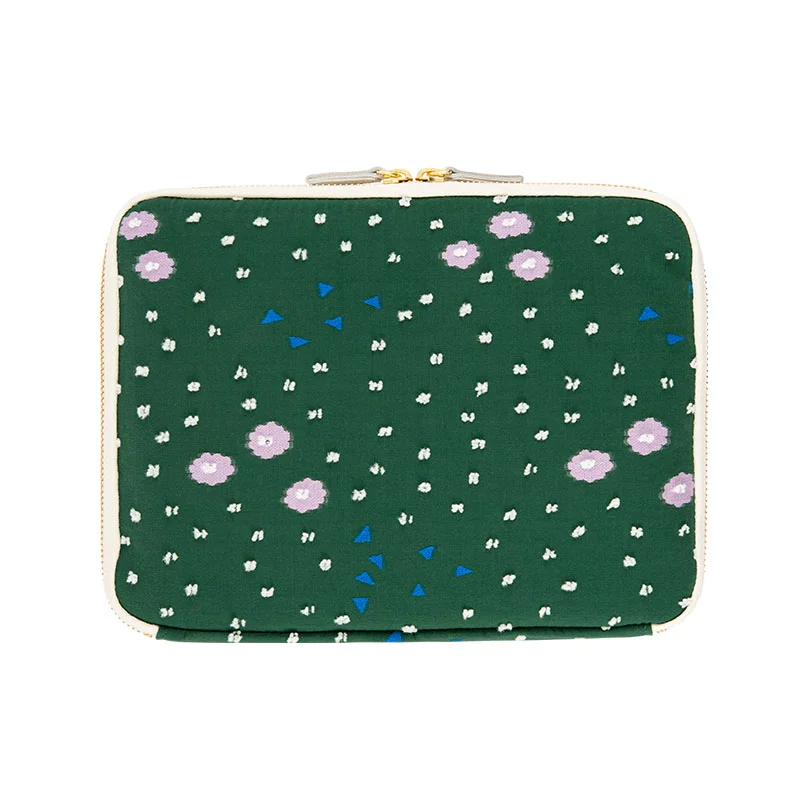 Makino Collection: Desk Garden is a soft, silky green fabric dotted with pink flowers. What makes it unique are the soft white spots that are sewn into the fabric. These white puff-balls are not sewn into the textile afterwards — they’re included at the time of manufacturing, so as long as you do not pull at the fabric too strongly, these spots will not fall off of the cover. The color of the interior is white.