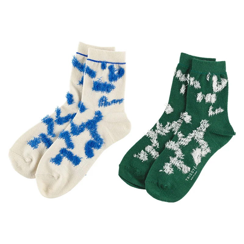 Unlike the pajamas with prints on organic fabric, socks are made of stretchy knitted fabric. In collaboration with Tricoté, a lifestyle brand that offers products made from knit fabrics, we used knitted fabric to express the pattern using yarns of different textures. They come in two colors: white and blue, and green and white.