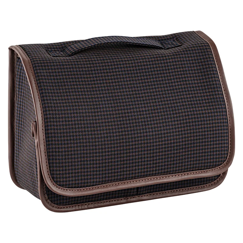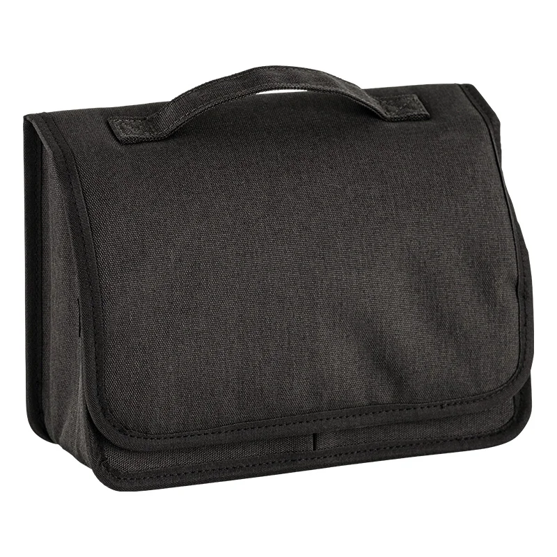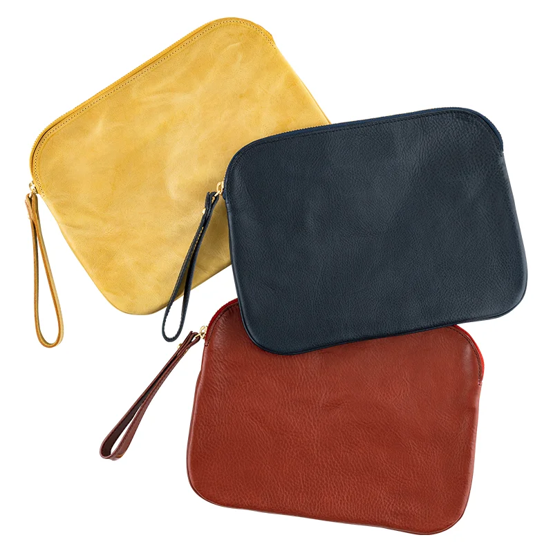 The bag is accented with a small gray-beige leather handle on one side that makes it easy to pull out from a backpack or handbag. It also has an outer front pocket for cards or other often-used items, and a postcard-size outer back pocket for storing notes and small notebooks.
