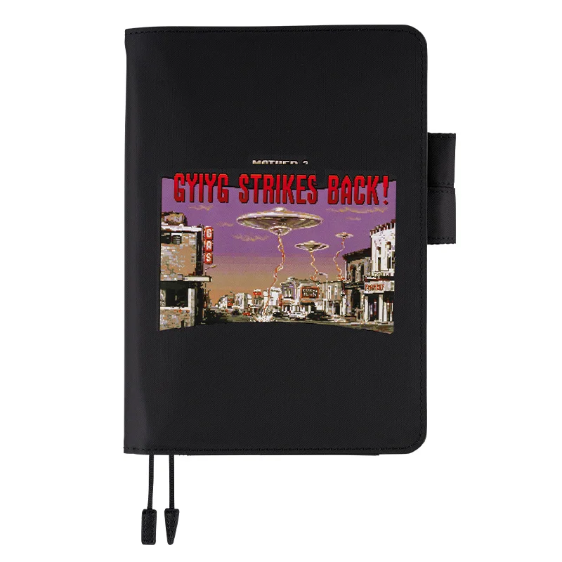 This techo has a cover design based on Shigesato Itoi's 1994 Super Nintendo game, MOTHER 2 (EarthBound in North America). It features a print of the shop in Saturn Valley on a deep moss-green cover.