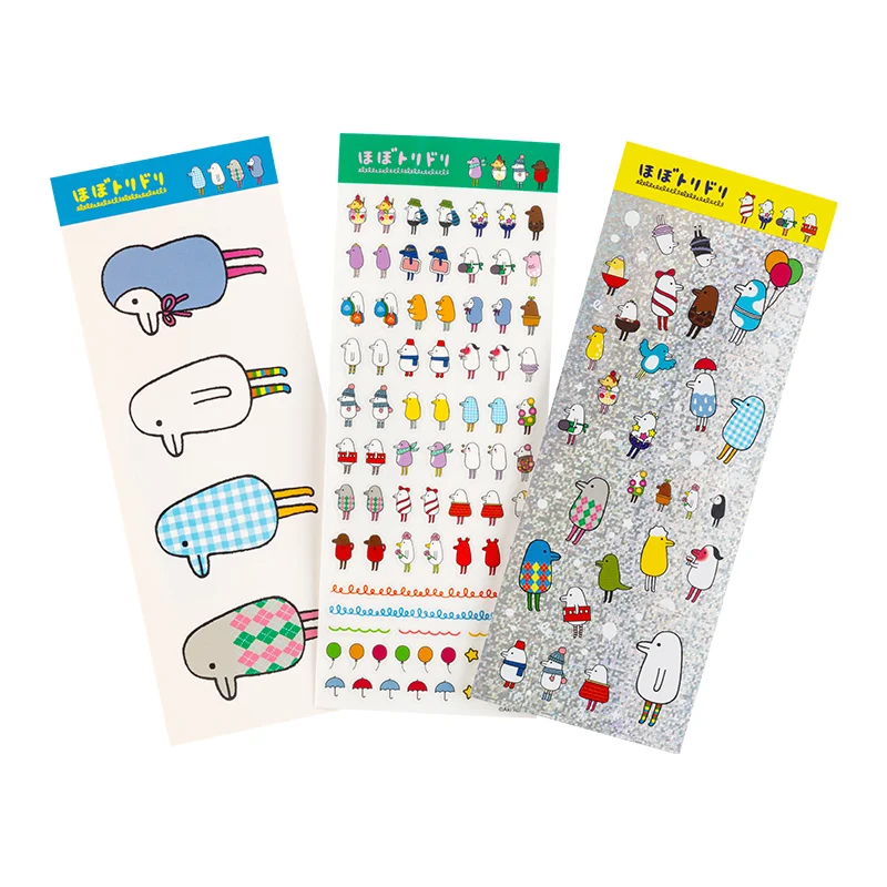 Aki Kondo, creator of many characters including Rilakkuma and Mofy the rabbit, helped us create Hobotoridori. Each of them is so engrossed in things they like that they even change their shape to match it. There are many different types of Hobotoridori, and these stickers follow 3 different themes.