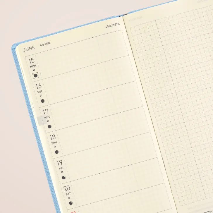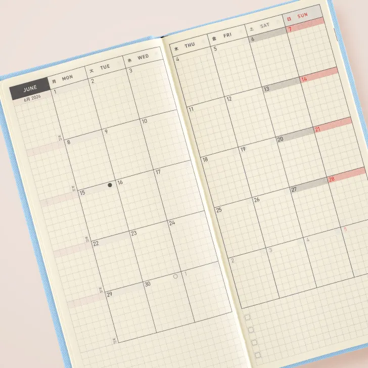 The Hobonichi Techo Weeks is a slim, easy-to-carry planner with a weekly horizontal schedule layout. The main pages follow a “Weekly Schedule + Memo” format, making it simple to keep track of your plans while providing more writing space than meets the eye.