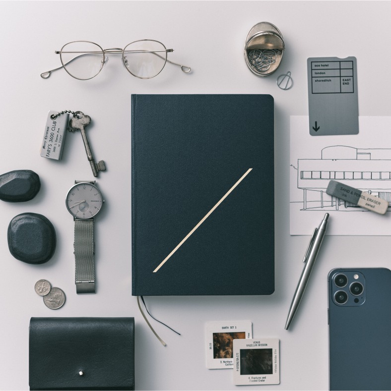 This is one of the basic design options for the HON. The dark navy cover almost looks black, and the diagonal slash is foil-printed in gold. The design is based on the forward-slash symbol ( / ) used when writing dates.