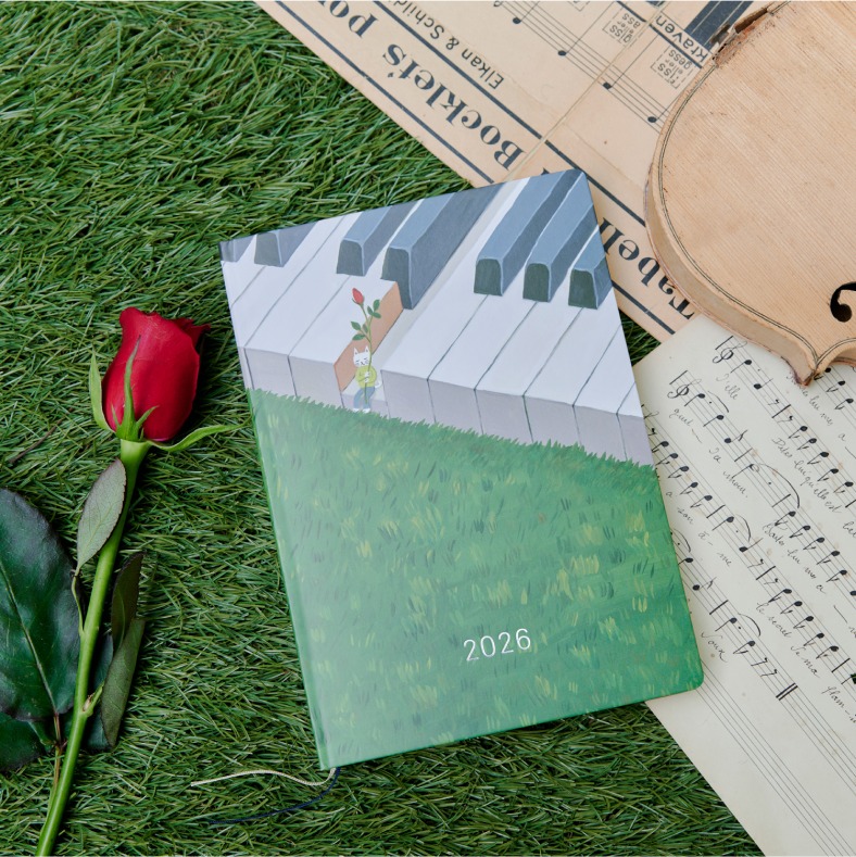 A cat quietly sits on the keyboard of a piano. In this quiet world, someday, you'll be able to hear the music when it reaches your ear...that’s the feeling this design evokes. Kubota picks up the imagery of a previous work and further expands the world.