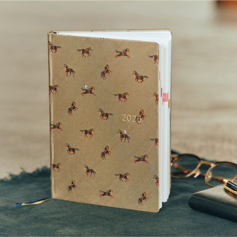This series uses the same textured, shiny fabric used in neckties. Inspired by the zodiac sign for 2026, this design shows horses walking and galloping in a row.