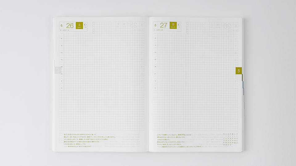 - Time Table/Graph Paper/Favorites/My 100/日本全国ローカルごはんリスト/ほぼ日のTKストレッチ/世界の人と、ちょっとおしゃべりを。/二十四節気のこと/もしものときの、準備をしよう/Gifts/満年齢早見表/単位換算表/くらしのリンク集/Addresses(for 8 people)/Personal Notes
