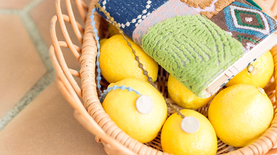 糸の先を紐の編み目にさし込んでお使いください。- パッチワークの生地の色や柄は