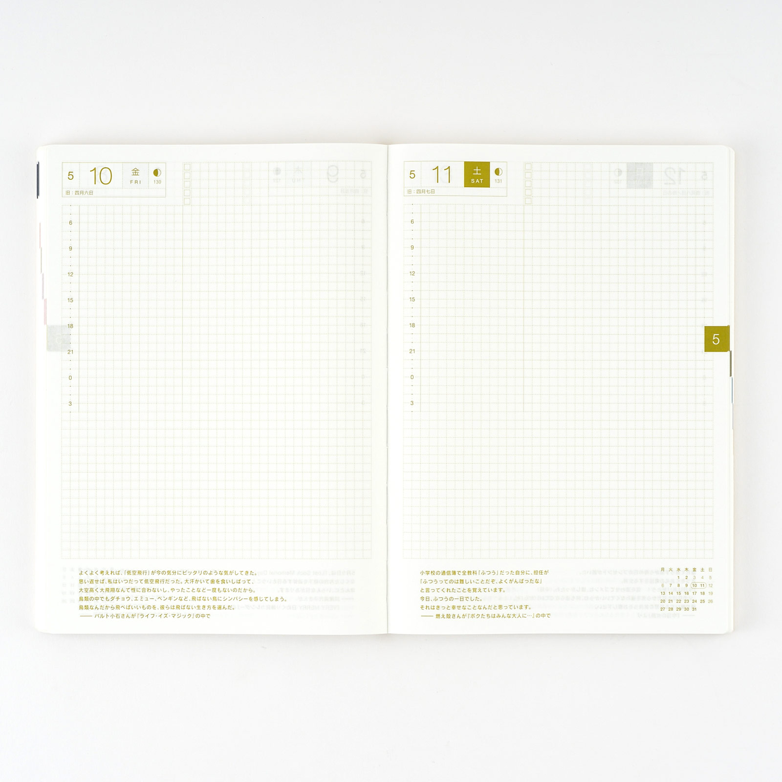 | 記載される内容 | 日番号/週番号(月間カレンダーに記載)/旧暦/六曜(大安、仏滅など)(月間カレンダーに記載)/二十四節気(立春、春分、夏至など)、雑節/祝日、記念日など(バレンタインデー、ひなまつり、母の日、父の日など)/月の満ち欠け(1日ページ全ページに記載、月間カレンダー・週間ダイアリーに満月と新月のみ記載) |