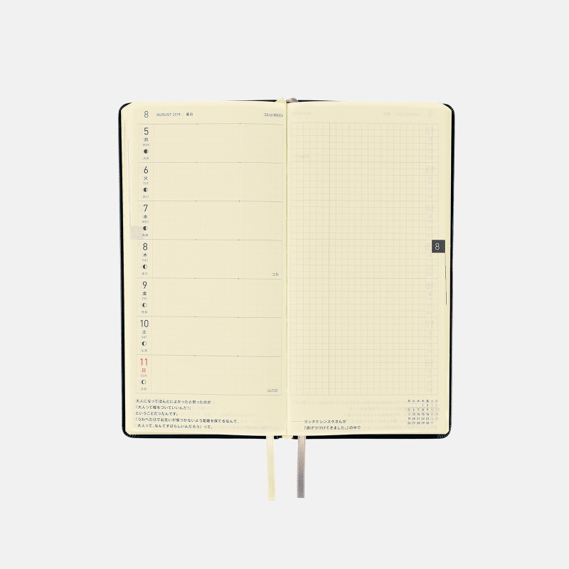 | 記載される内容 | 週番号/六曜(大安、仏滅など)/二十四節気(立春、春分、夏至など)/祝日、記念日など(バレンタインデー、ひなまつり、母の日、父の日など)/月の満ち欠け(週間ページ全てに記載・月間カレンダーに満月と新月のみ記載) |