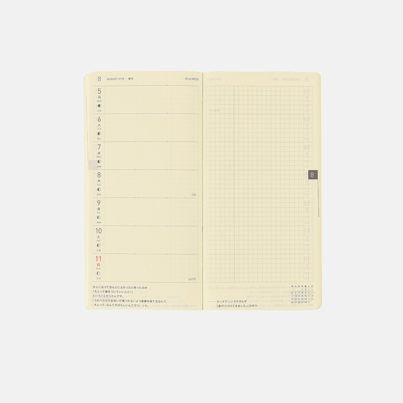 | 記載される内容 | 週番号/六曜(大安、仏滅など)/二十四節気(立春、春分、夏至など)/祝日、記念日など(バレンタインデー、ひなまつり、母の日、父の日など)/月の満ち欠け(週間ページ全てに記載・月間カレンダーに満月と新月のみ記載) |