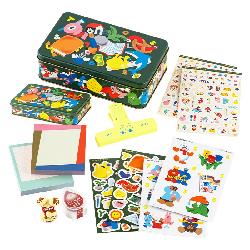 | サイズ | 缶:縦118mm×横192mm×厚さ55mm クリップ:縦65mm×横100mm×厚さ25mm スタンプ:縦46mm×横34mm×厚さ27mm スタンプインク:縦50mm×横33mm×厚さ22mm メモパッド:縦96mm×横82mm×厚さ10mm シール:縦148mm×横100mm ダイカットカード:縦98mm×横135mm |