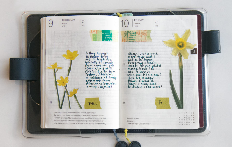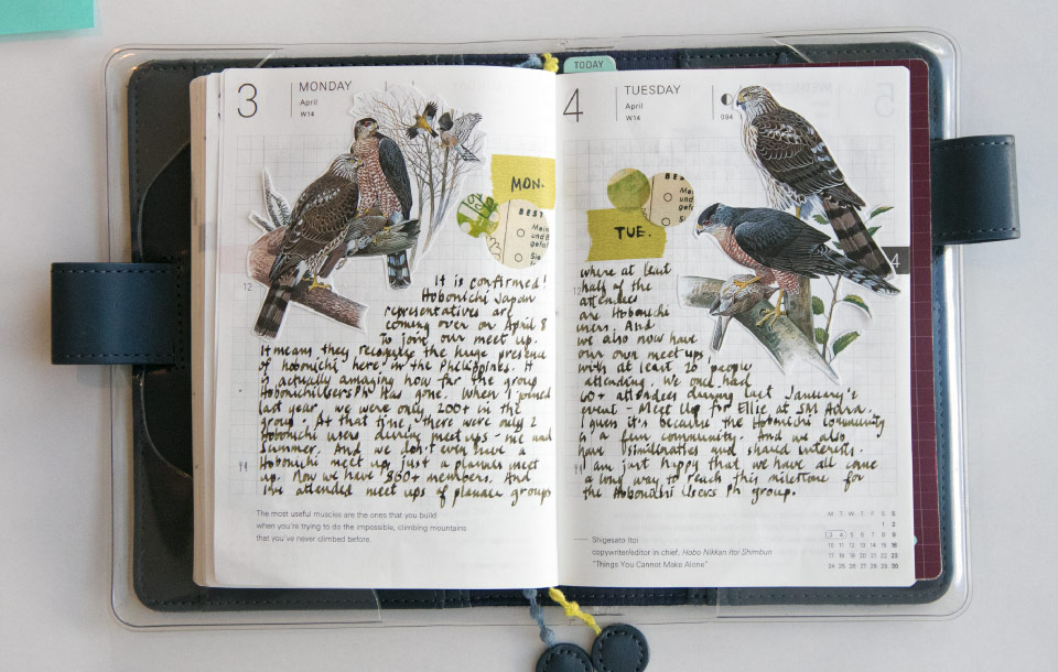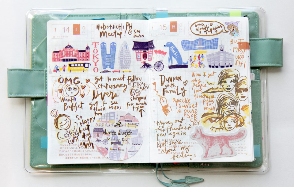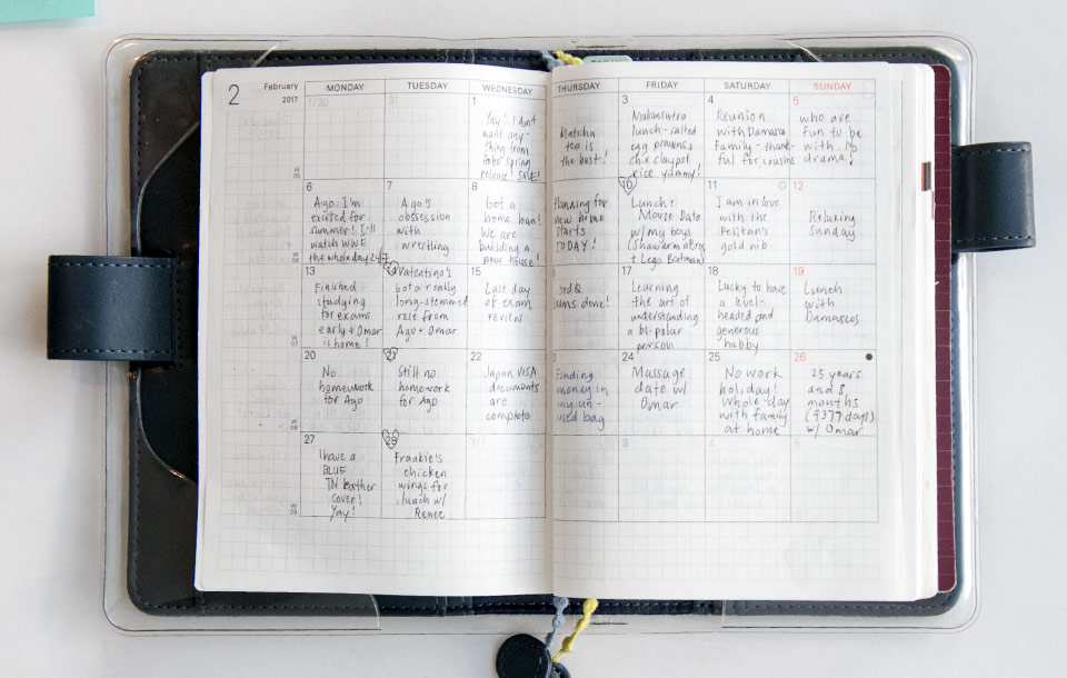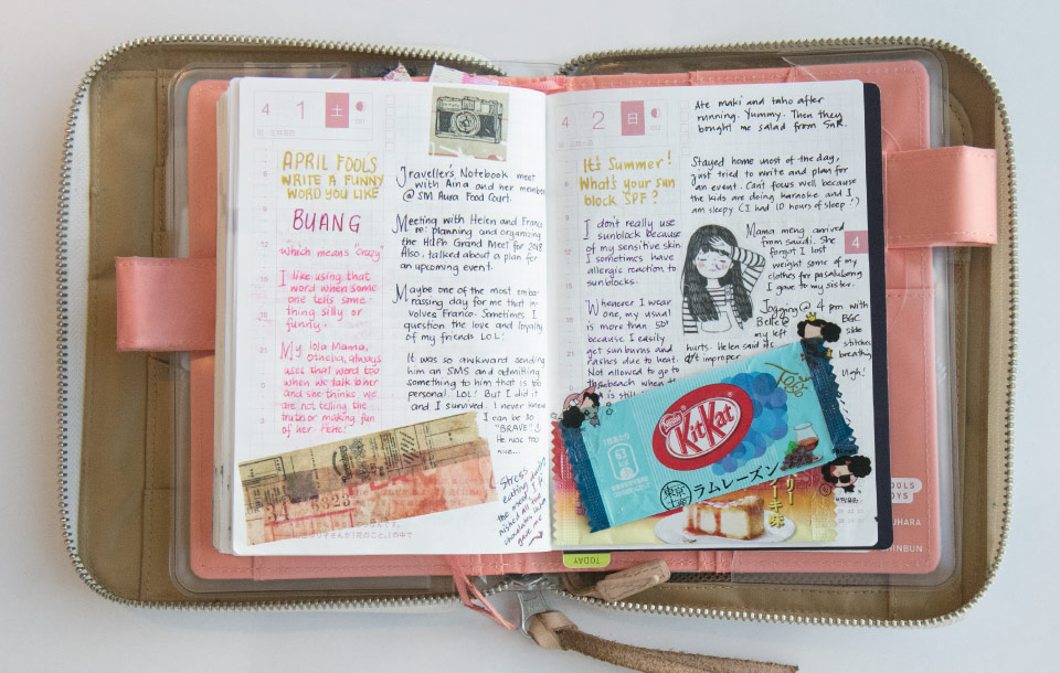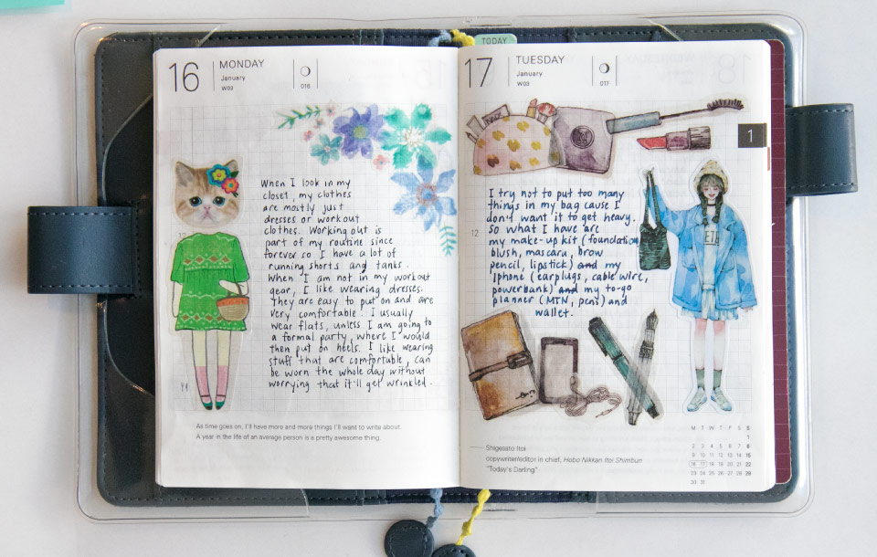 使い初めて1年半です。月間ページには、その日笑顔になれたことを一日ひとつ書いています。それは、子どもが言ったひとことや、日本からほぼ日スタッフがマニラに来ることだったり、使っていなかったバッグからお金が見つかったっていうことだったり。1日ページには、マスキングテープでデコレーションをして、毎晩寝る前に日記を書いています。私は絵が苦手なんだけど、こうすればたのしくまとめられるので、うれしいです!