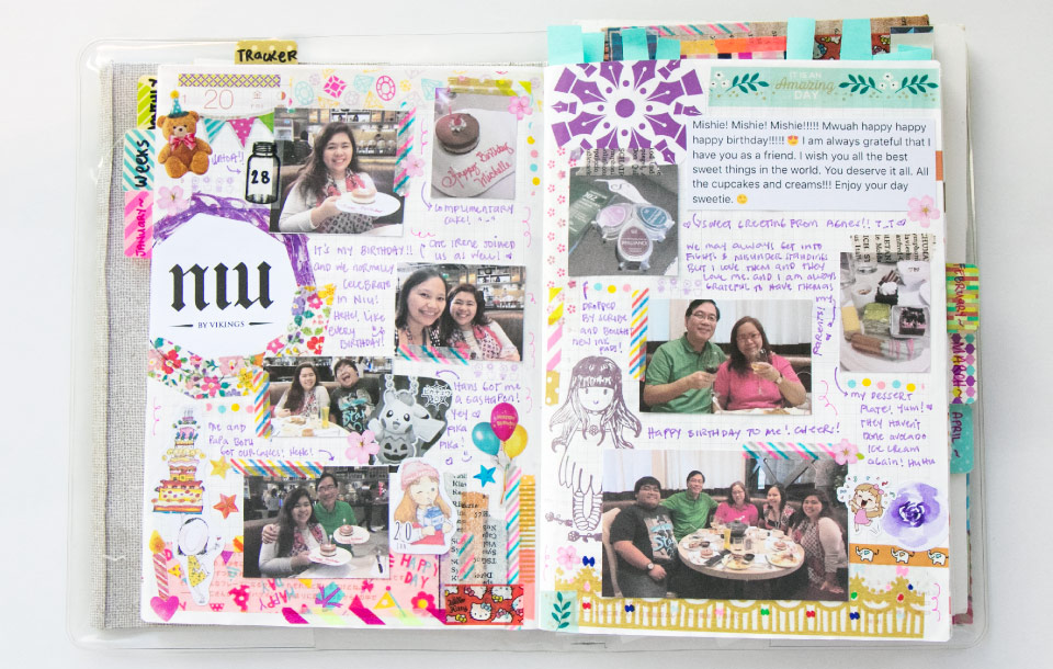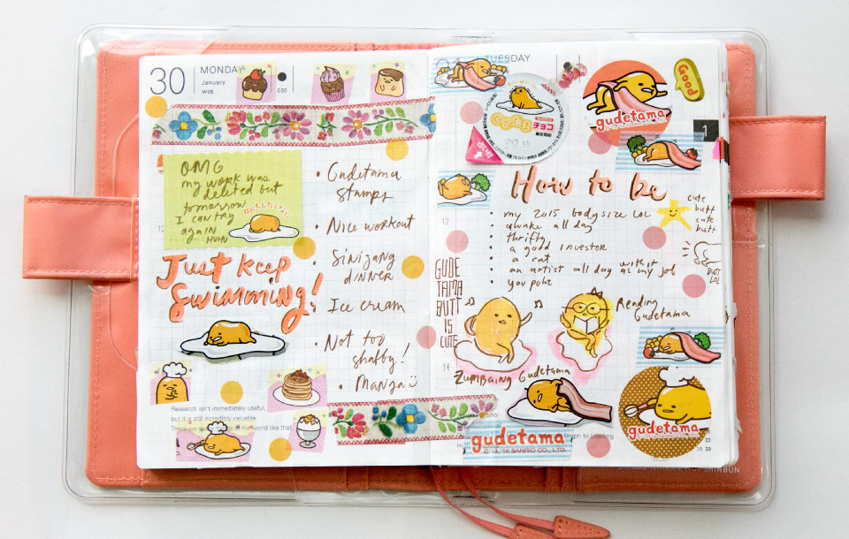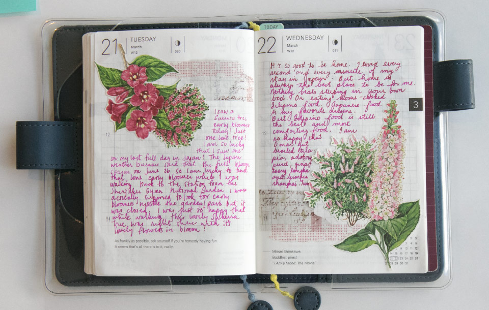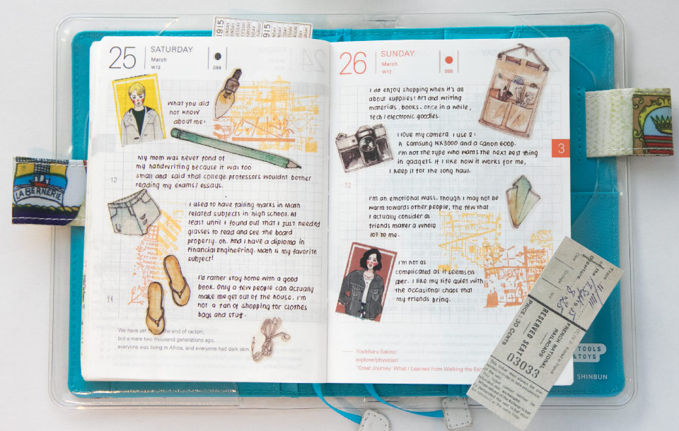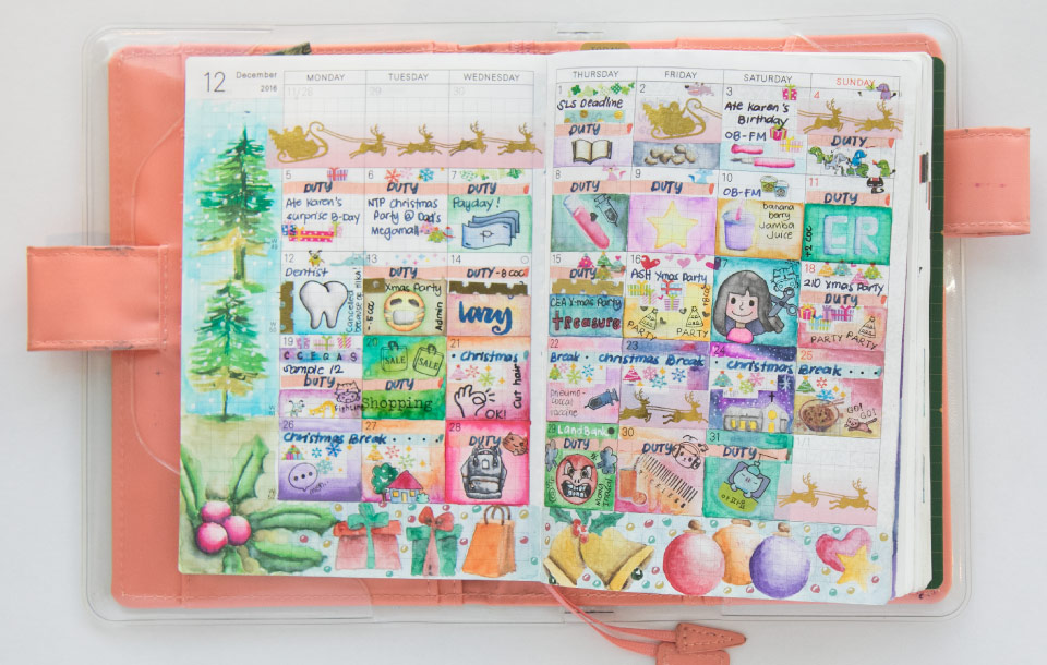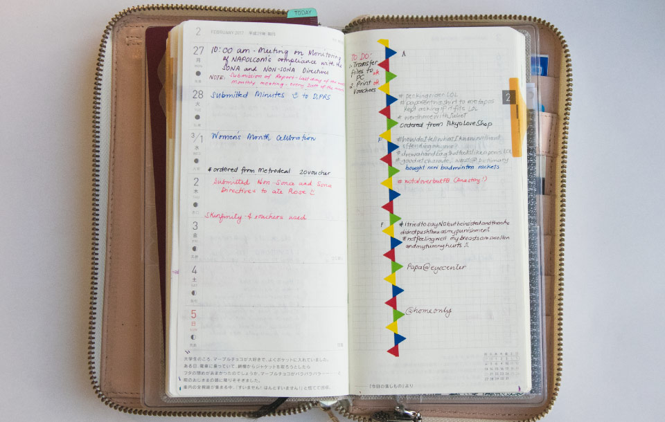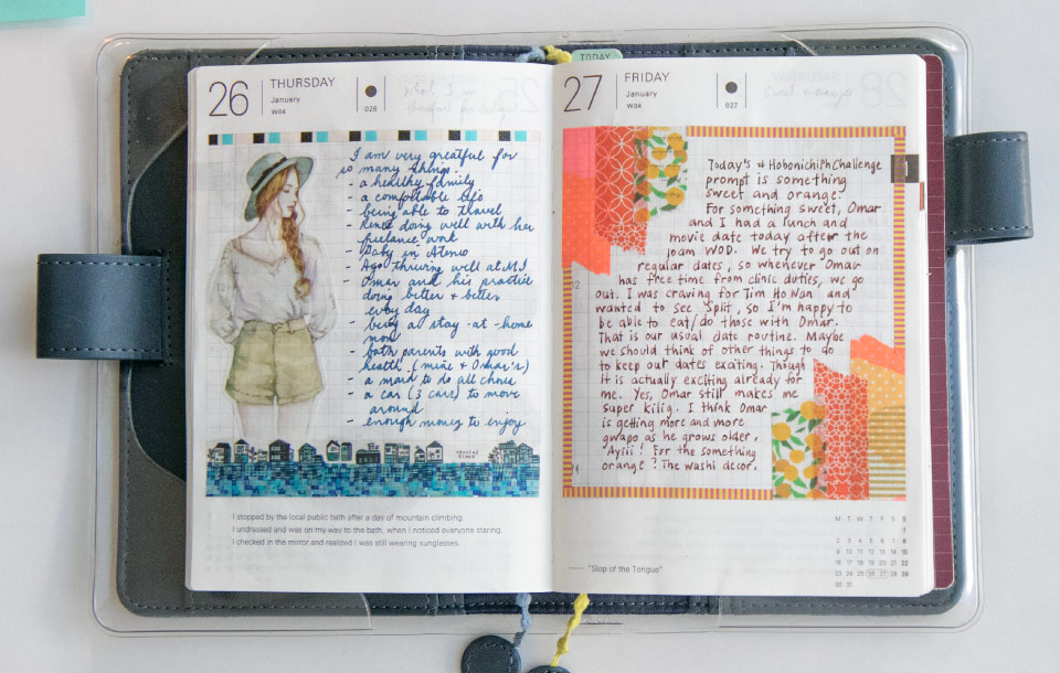 使い初めて1年半です。月間ページには、その日笑顔になれたことを一日ひとつ書いています。それは、子どもが言ったひとことや、日本からほぼ日スタッフがマニラに来ることだったり、使っていなかったバッグからお金が見つかったっていうことだったり。1日ページには、マスキングテープでデコレーションをして、毎晩寝る前に日記を書いています。私は絵が苦手なんだけど、こうすればたのしくまとめられるので、うれしいです!