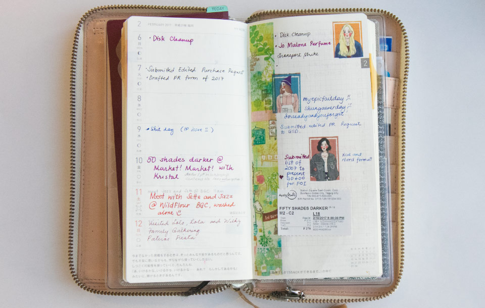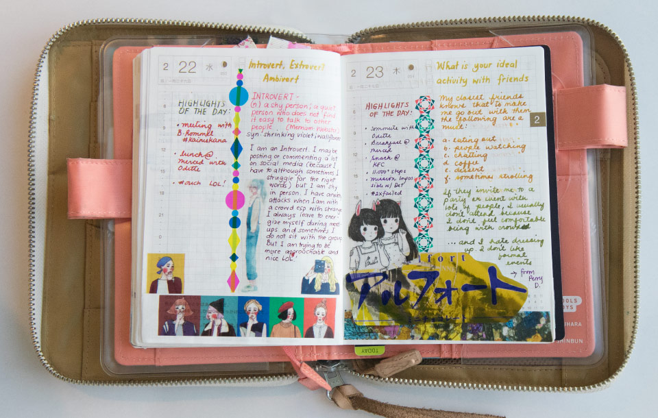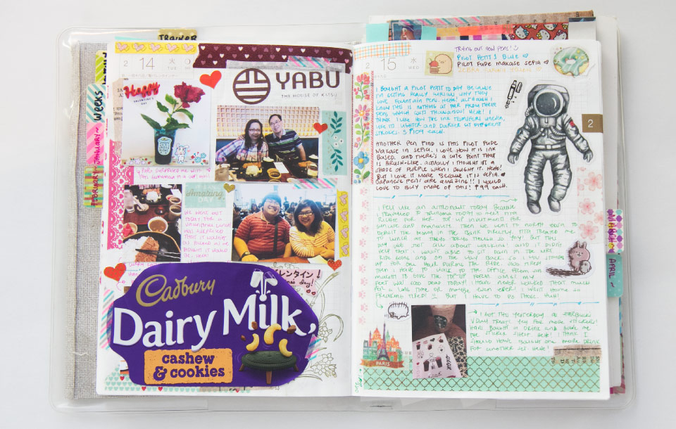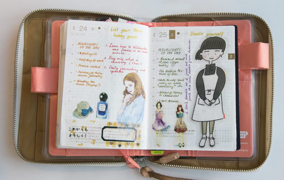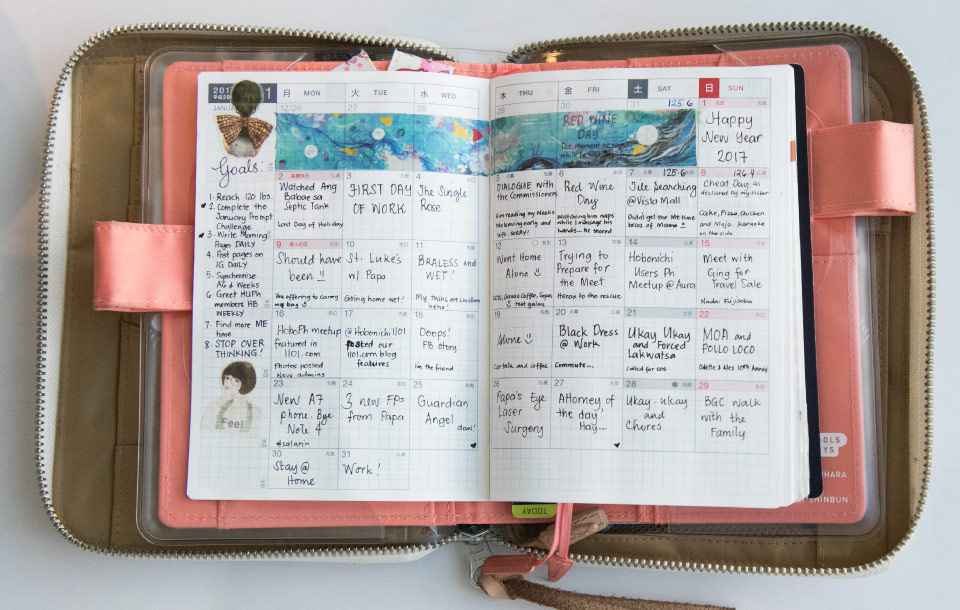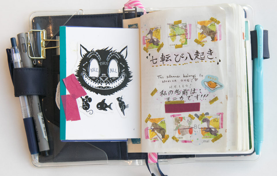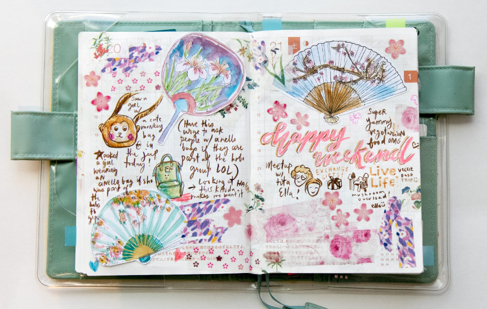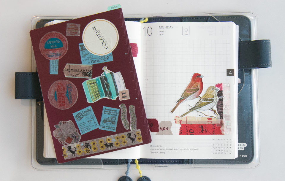 私はオリジナル(日本語版)とweeksの2冊使い。オリジナルの方はジッパーズの中にカバー・オン・カバー付きのバタフライストッパーカバーを入れています。オリジナルには、その日のできごとを短くリストアップしたり、その日あったいいことを書いたり。あとは好きなイラストをラミネート加工して貼ったり、お菓子のパッケージなどを切ってコラージュしていますね。weeksには仕事やイベントの予定を書いています。