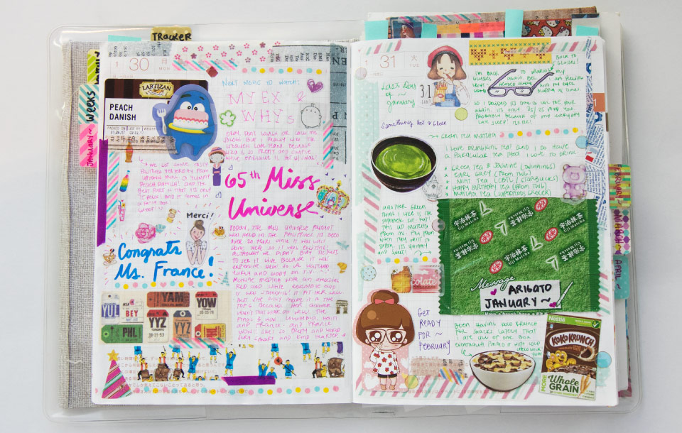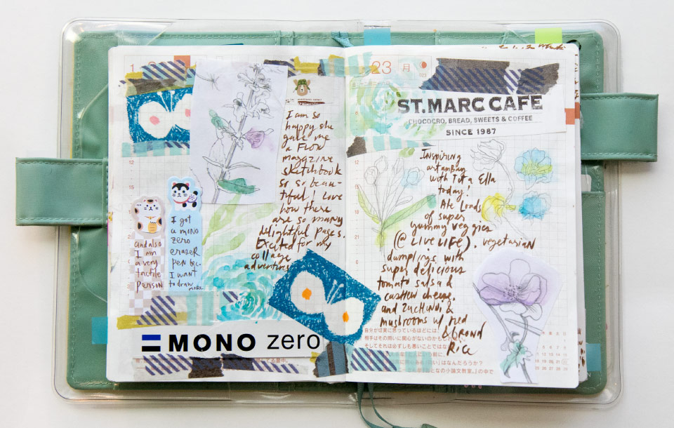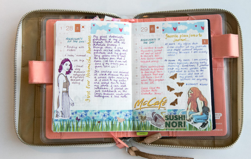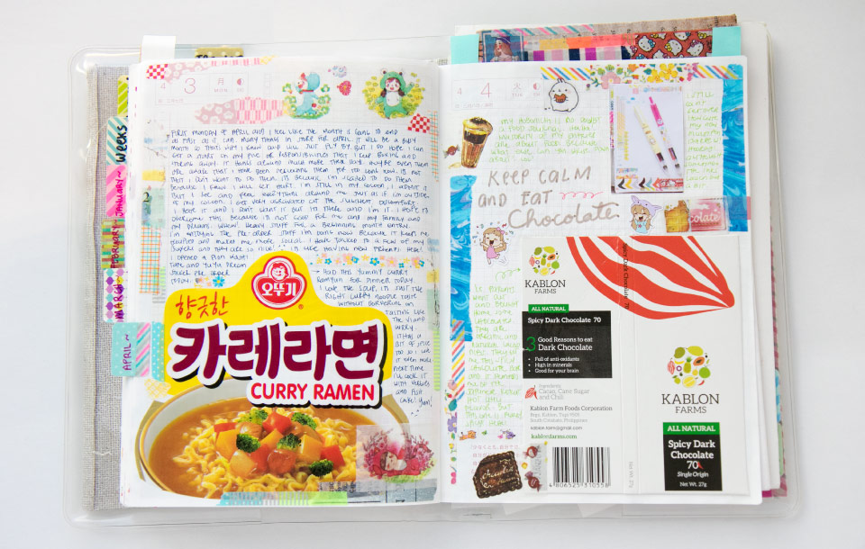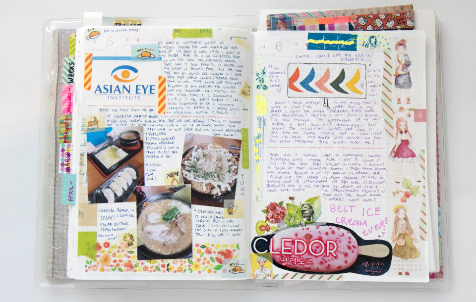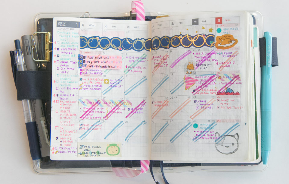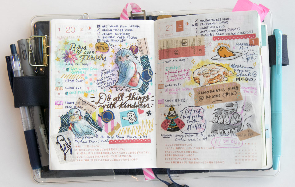 私はオリジナル(日本語版)とweeksの2冊使い。オリジナルの方はジッパーズの中にカバー・オン・カバー付きのバタフライストッパーカバーを入れています。オリジナルには、その日のできごとを短くリストアップしたり、その日あったいいことを書いたり。あとは好きなイラストをラミネート加工して貼ったり、お菓子のパッケージなどを切ってコラージュしていますね。weeksには仕事やイベントの予定を書いています。