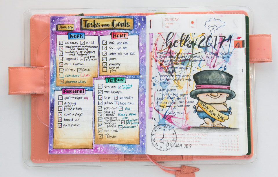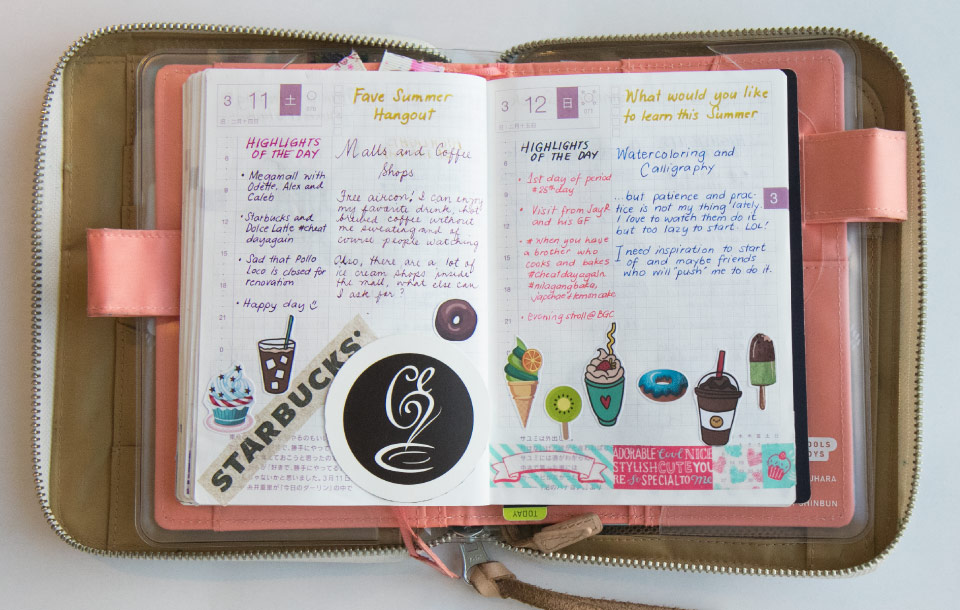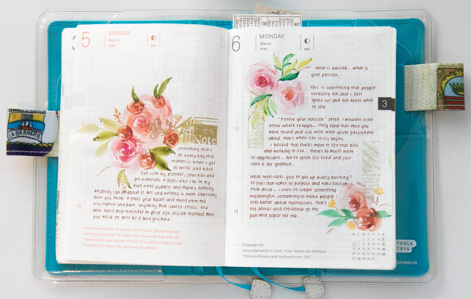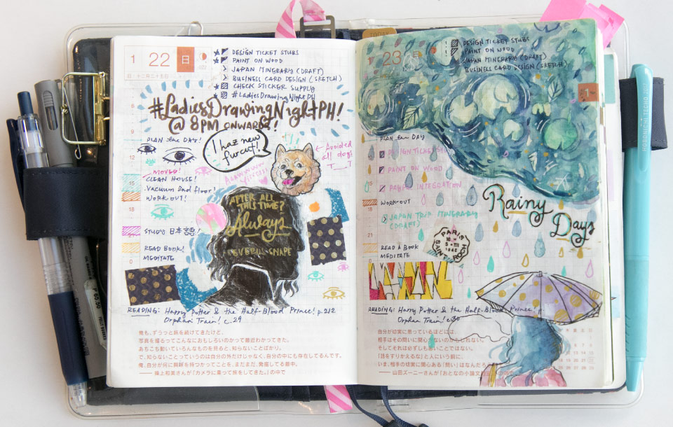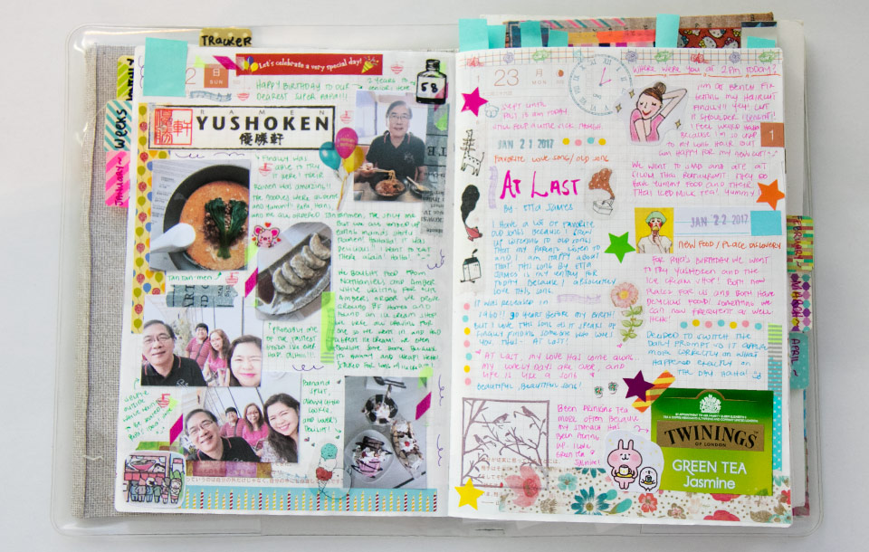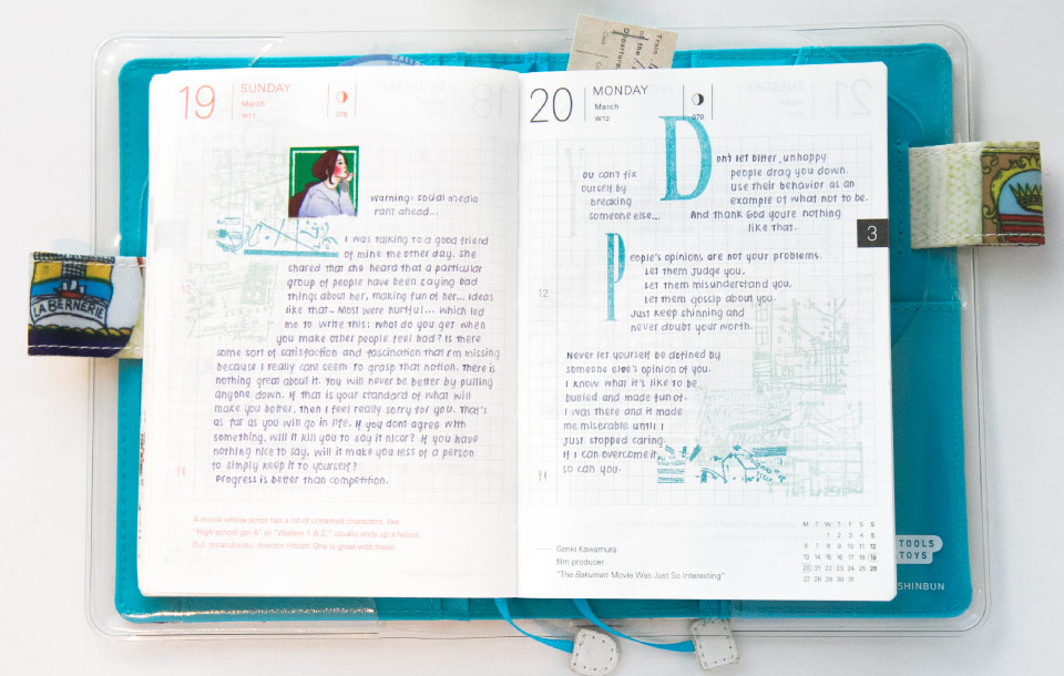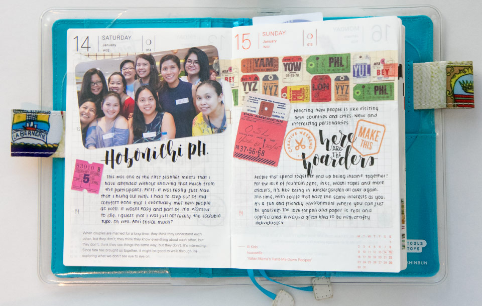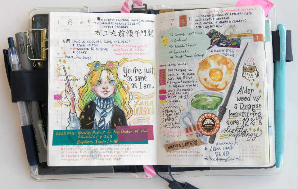 私はオリジナル(日本語版)とweeksの2冊使い。オリジナルの方はジッパーズの中にカバー・オン・カバー付きのバタフライストッパーカバーを入れています。オリジナルには、その日のできごとを短くリストアップしたり、その日あったいいことを書いたり。あとは好きなイラストをラミネート加工して貼ったり、お菓子のパッケージなどを切ってコラージュしていますね。weeksには仕事やイベントの予定を書いています。