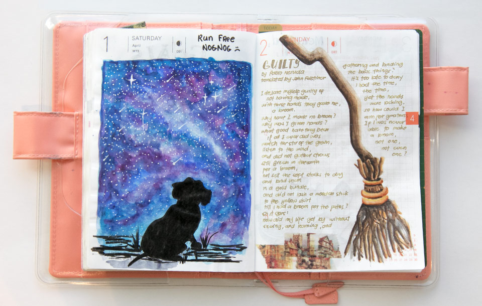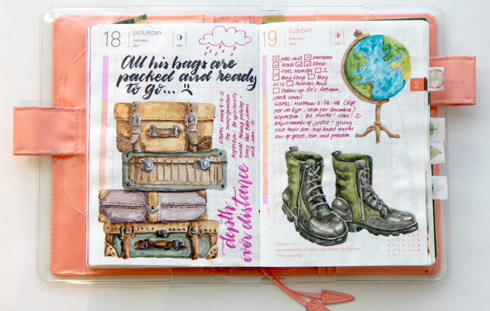 初めて実物を見たのは、2年前に日本のロフトに行ったとき。紙がすごく薄かったから、水彩絵の具で描いて大丈夫なのかが不安で、そのときは買わなかったんです。使い始めたのは今年からで、家に置く「HOMEbonichi」と、いろんなところに連れていく「ROAMbonichi」の2冊使いです。ほぼ日手帳の好きなところは、紙、カラフルなカバー、そしてコミュニティ。使いはじめてから、新しい仲間がたくさんできたんですよ。