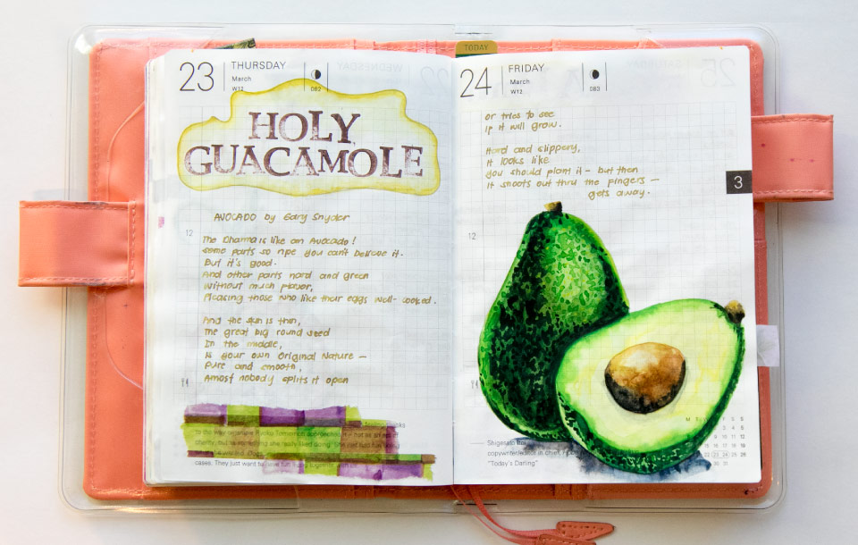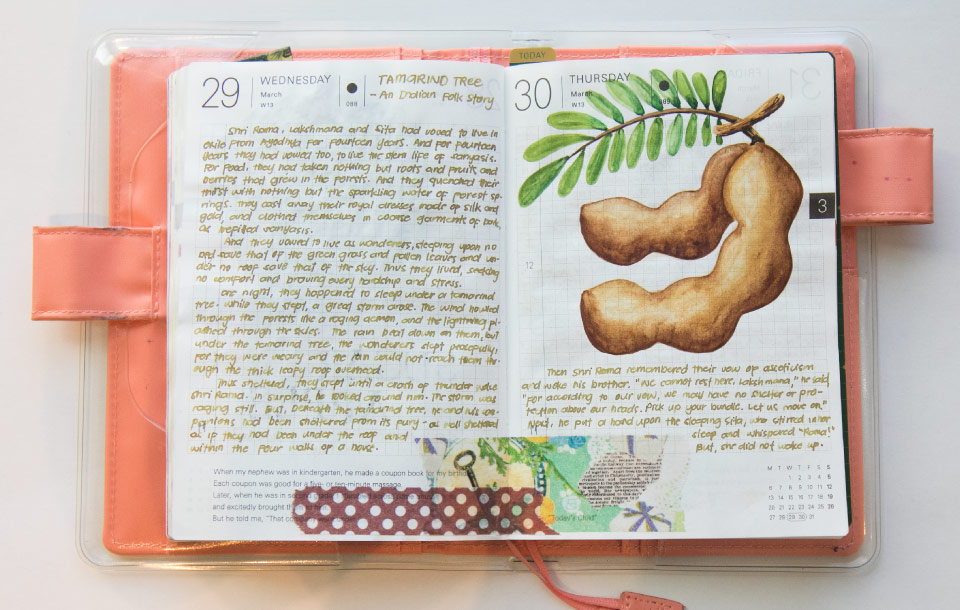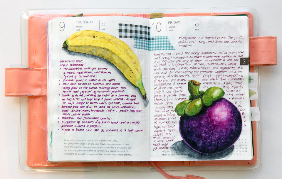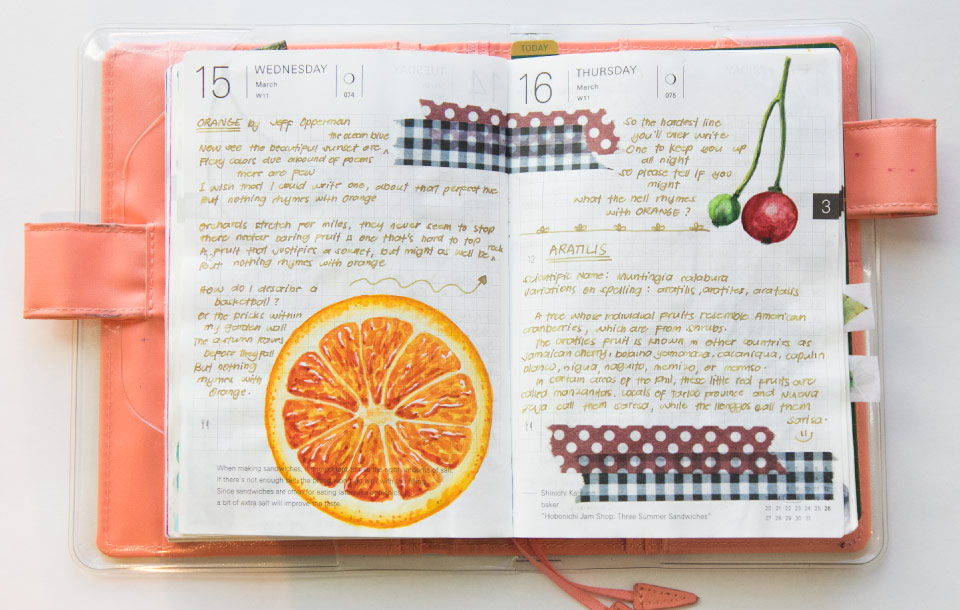今年の1月から使っています。英語の言葉を読むのが好きなので、英語版にしました。いろんな手帳やスケジュール帳があるけど、ほぼ日手帳がいちばん好き! だいたい、夜にその日の予定や印象深かったできごとを書いています。あるとき、トモエリバーの紙に水彩絵の具でもきれいに描けることを発見。それからは果物とか野菜とか、好きなものをランダムに描いています。月間スケジュールのページにも、水彩絵の具を使っています。