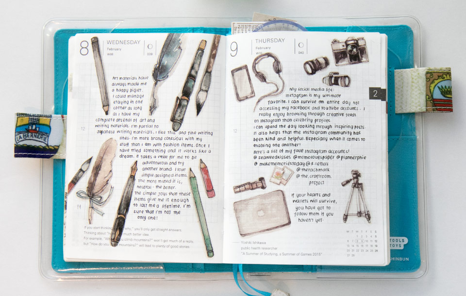 2015年の後半から使っています。インスタグラムで見つけて、方眼のページやデザインにひとめぼれしたんです。買ったのは、「Scribe Writing Essentials」という文具店。どこへ行くにもいっしょで、仕事中のちょっとした隙間時間など、いつでも書きたいときに書いています。手帳を書いているとイライラしたことがあっても気分転換できるし、幸せでリラックスした気持ちになれるんですよね。