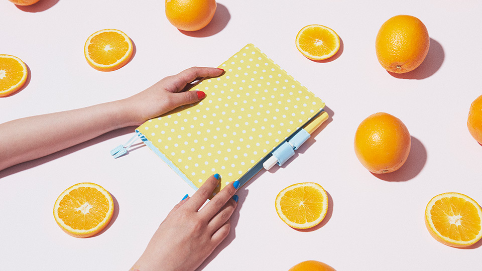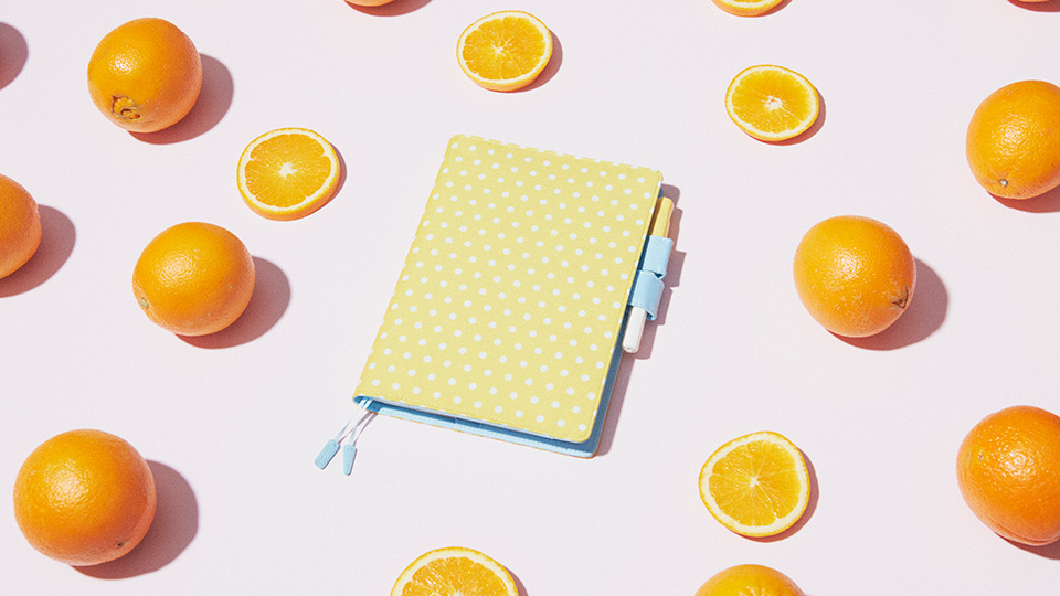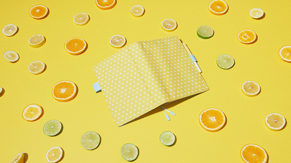 This design features vibrant yellow material overlayed with a white polka-dot pattern. Between the bright exterior and pleasant light blue of the cover interior and pen holder, the cover is reminiscent of a refreshing, juicy citrus fruit. This cheerful cover is sure to invigorate its user so they can face the day’s challenges together.