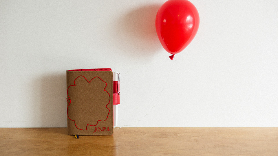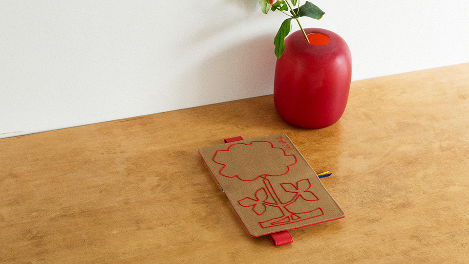 Cacuma is a fashion brand created in collaboration with art director/designer Yoshie Watanabe and Hobonichi. This Cacuma-brand cover features red embroidery on coarse canvas material. The pattern seems abstract at first glance, but open the cover and view it in full to see the image of a rose embroidered in a way that looks like a single-stroke drawing.