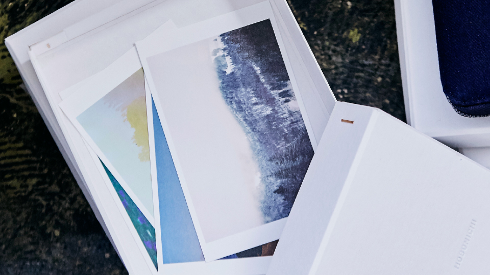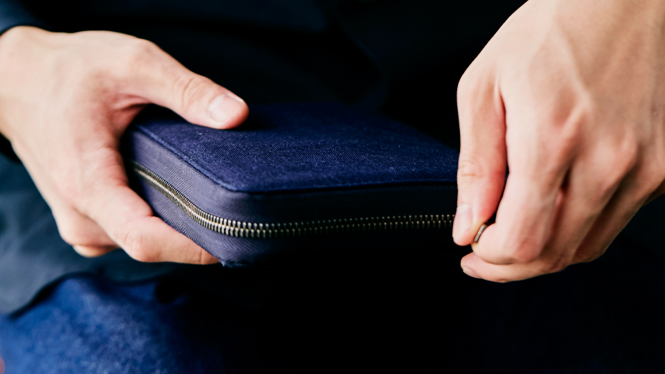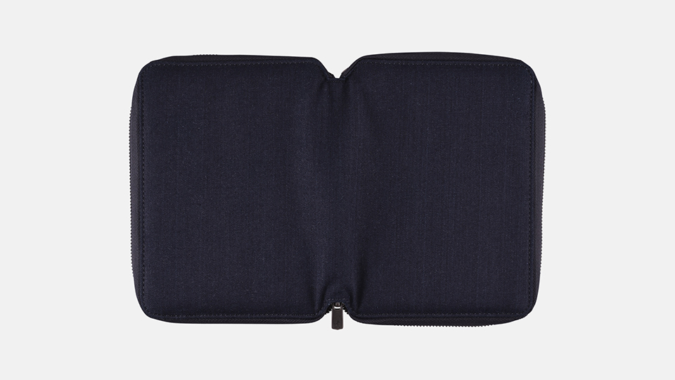The indigo blue material is a cotton-wool denim developed by a textile manufacturer in Kurashiki, Okayama Prefecture. The material transforms beautifully over time. The cover interior is made from deep navy leather.