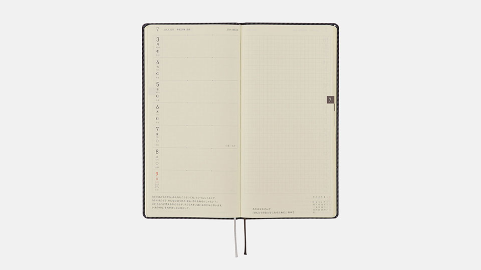 (Specifications may vary slightly)Weight Approx. 131 g Main material Cotton Total pages 240 pages Binding Type Stitch-binding Paper Type Tomoe River paper (planner-specific type) Grid size 3.55 mm Yearly Calendar 2016 - 2018 Yearly Index Apr. 2017 - Mar. 2018 (2 pages) Monthly Calendar Mar. 2017 - Apr. 2018 (28 pages) Quotes One per week Weekly Calendar Feb. 27, 2017 - Apr. 1, 2018 (114 pages) Memo Page 76 pages Informational Pages Shorthand Note-Taking / Solar Terms / Favorite Local Japanese Sweets / Interacting with Cats and Dogs / Emergency Preparedness / Useful First Aid Tips / Age Table / Conversion Table / Useful Links / Contact Book / Personal Notes Listed information Week numbers / Rokuyo (Traditional Japanese calendar) / Solar terms (Japanese) / Japanese holidays / Moon phase (weekly pages include daily phase, monthly calendars only include full and new moon)