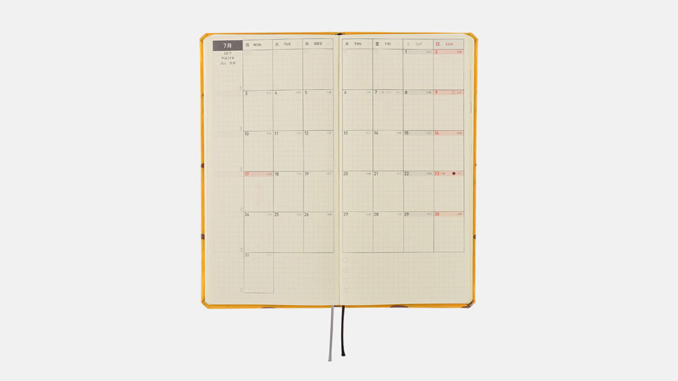 (Specifications may vary slightly)Weight Approx. 135 g Main material Polyester Total pages 240 pages Binding Type Stitch-binding Paper Type Tomoe River paper (planner-specific type) Grid size 3.55 mm Yearly Calendar 2016 - 2018 Yearly Index Apr. 2017 - Mar. 2018 (2 pages) Monthly Calendar Mar. 2017 - Apr. 2018 (28 pages) Quotes One per week Weekly Calendar Feb. 27, 2017 - Apr. 1, 2018 (114 pages) Memo Page 76 pages Informational Pages Shorthand Note-Taking / Solar Terms / Favorite Local Japanese Sweets / Interacting with Cats and Dogs / Emergency Preparedness / Useful First Aid Tips / Age Table / Conversion Table / Useful Links / Contact Book / Personal Notes Listed information Week numbers / Rokuyo (Traditional Japanese calendar) / Solar terms (Japanese) / Japanese holidays / Moon phase (weekly pages include daily phase, monthly calendars only include full and new moon)