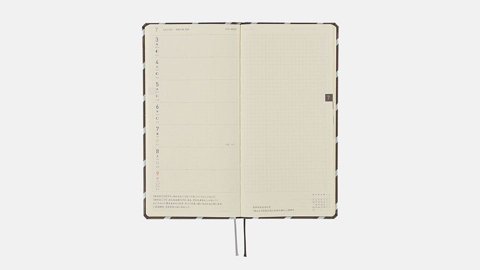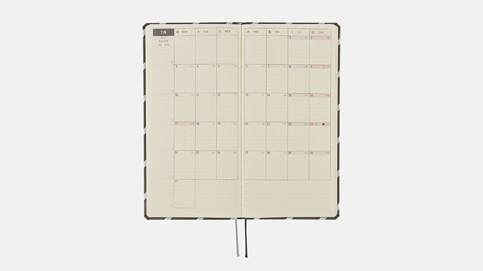 (Specifications may vary slightly)Weight Approx. 134 g Main material Polyester Total pages 240 pages Binding Type Stitch-binding Paper Type Tomoe River paper (planner-specific type) Grid size 3.55 mm Yearly Calendar 2016 - 2018 Yearly Index Apr. 2017 - Mar. 2018 (2 pages) Monthly Calendar Mar. 2017 - Apr. 2018 (28 pages) Quotes One per week Weekly Calendar Feb. 27, 2017 - Apr. 1, 2018 (114 pages) Memo Page 76 pages Informational Pages Shorthand Note-Taking / Solar Terms / Favorite Local Japanese Sweets / Interacting with Cats and Dogs / Emergency Preparedness / Useful First Aid Tips / Age Table / Conversion Table / Useful Links / Contact Book / Personal Notes Listed information Week numbers / Rokuyo (Traditional Japanese calendar) / Solar terms (Japanese) / Japanese holidays / Moon phase (weekly pages include daily phase, monthly calendars only include full and new moon)