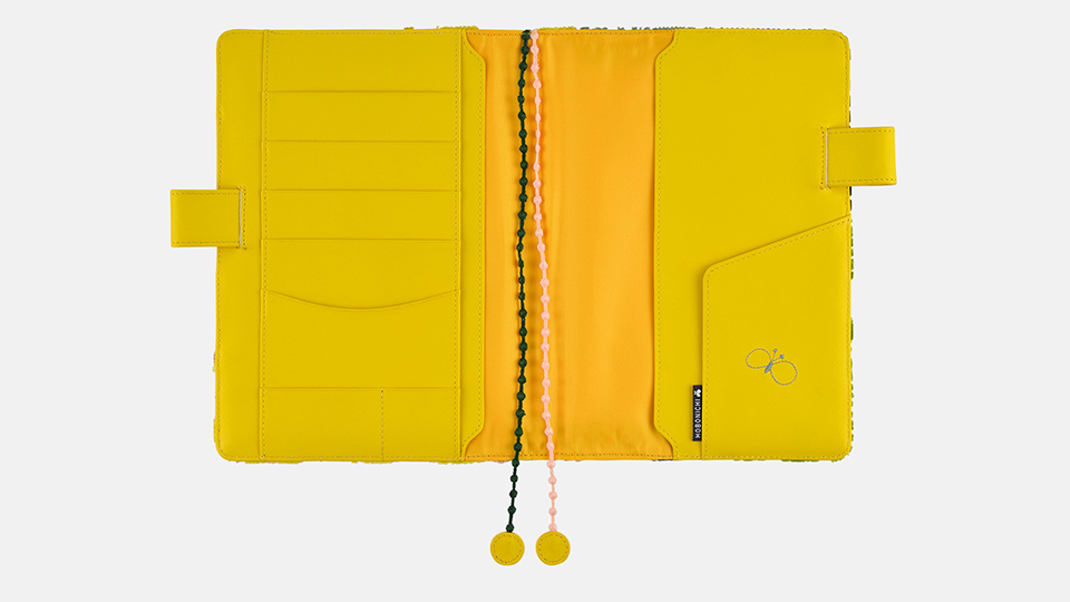 The cover interior and pen holder are made with yellow leather. The interior is accented with a butterfly embroidered with light blue threads, while the dual-colored bookmarks come in green and pink.