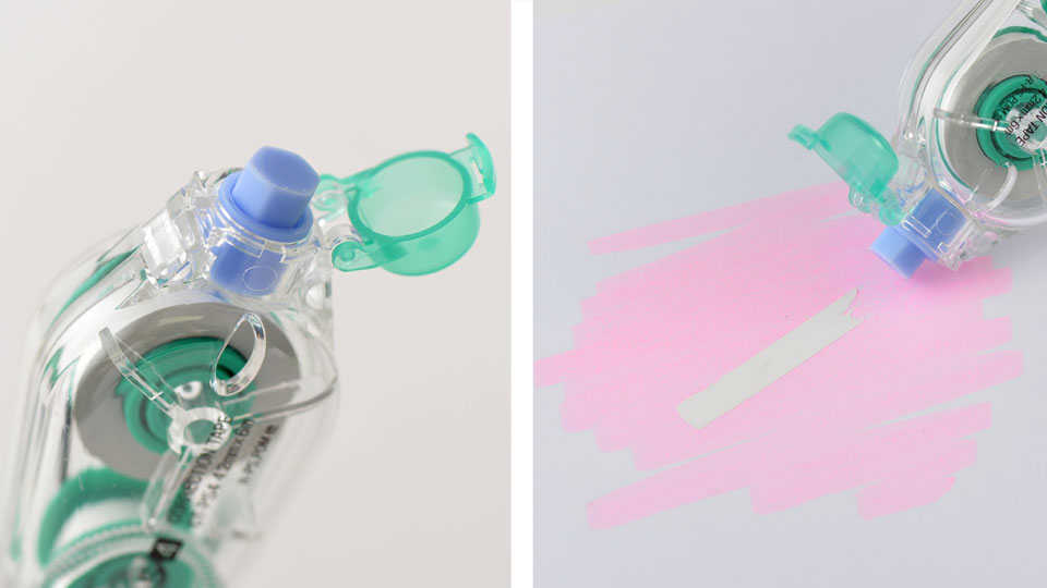 The tip of the dispenser has a sliding cover to close it during storage, and a special eraser on the dispenser allows you to rub away any excess correction tape.