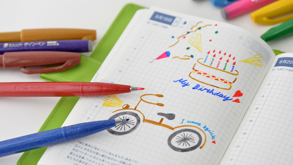 These water-based markers have brush tips for expressive writing. The bright colors of the aqueous dye ink won’t transfer even on the thin pages of the planner, and the ink dries relatively quickly. The brush tips provide a smooth writing experience great for writing or outlining illustrations with dynamic line thickness. The brush tips will start out somewhat firm, but will soften over continued use for a stronger “brush” feel.