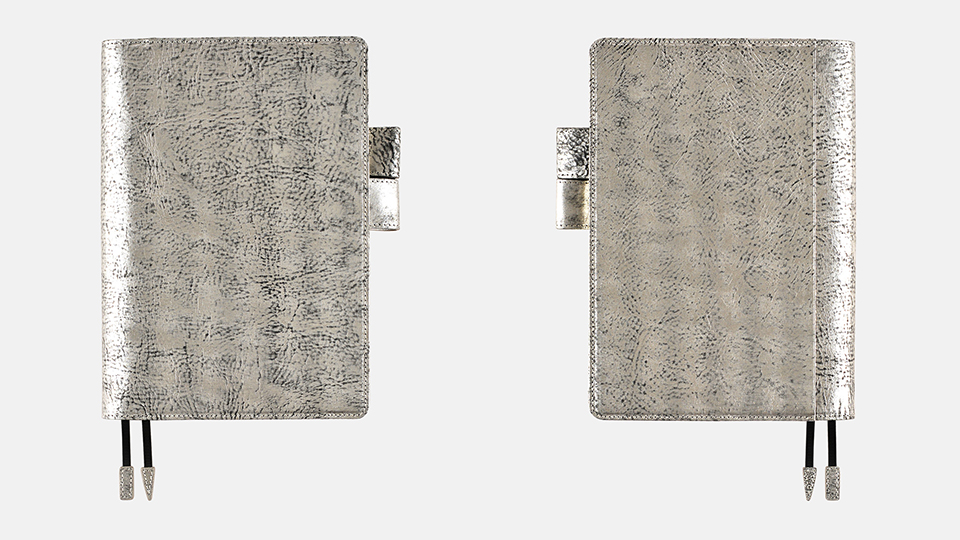 シルバーの箔づけをほどこしたイタリアの革、