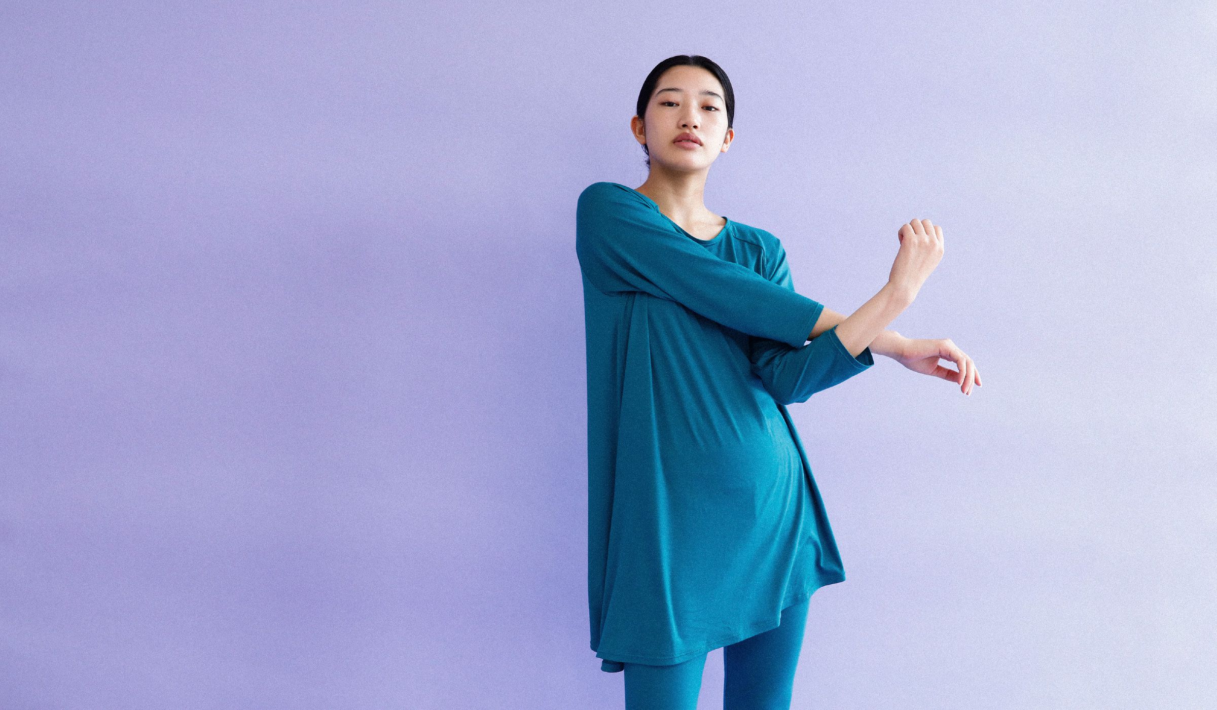 おなかまですっぽりカバーするレギンス。 伸びがよく、おなかを締めつけないので、 気持ちよく過ごせます。