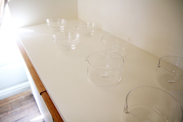 透明ガラスのうつわがならびます。